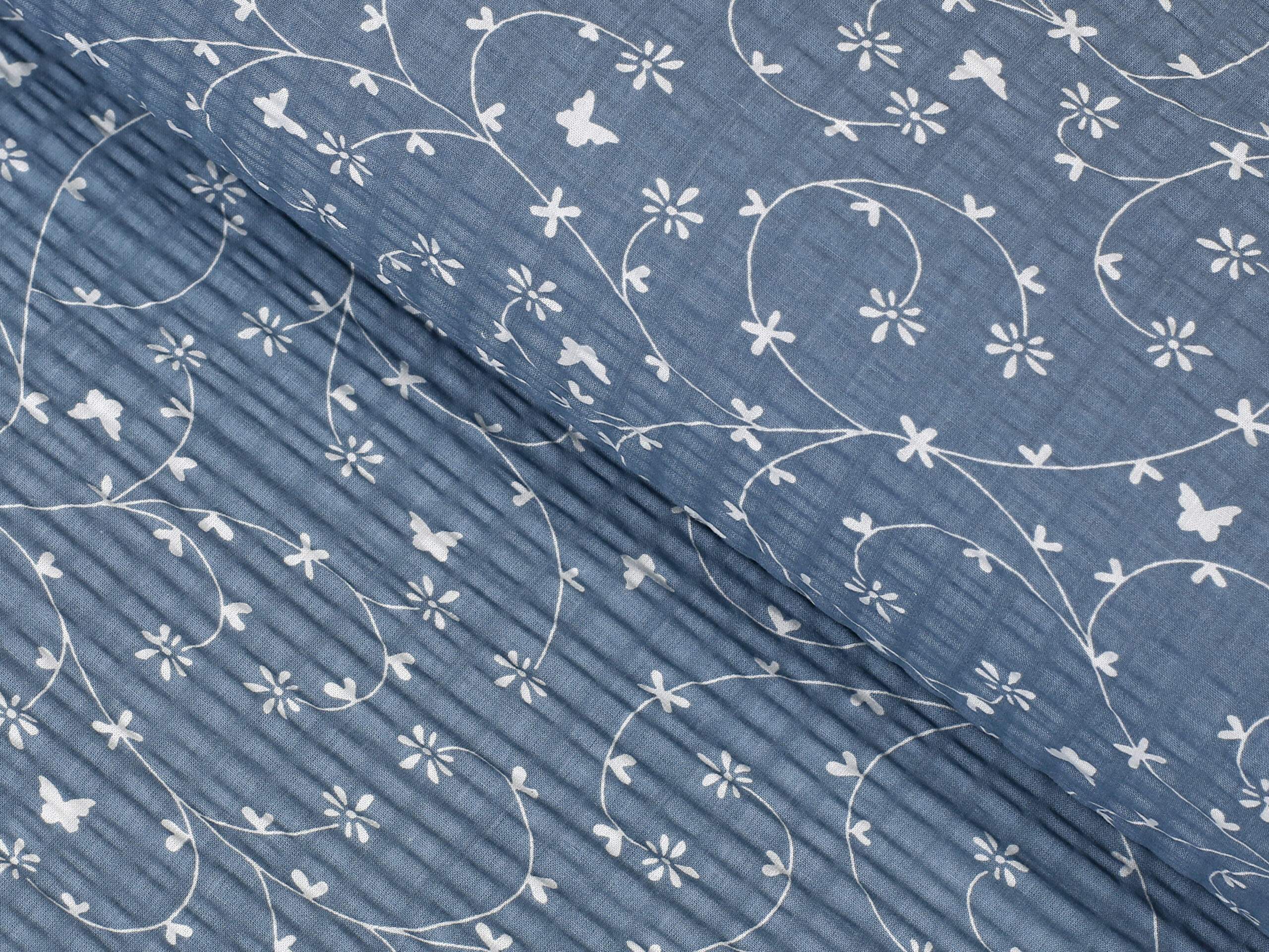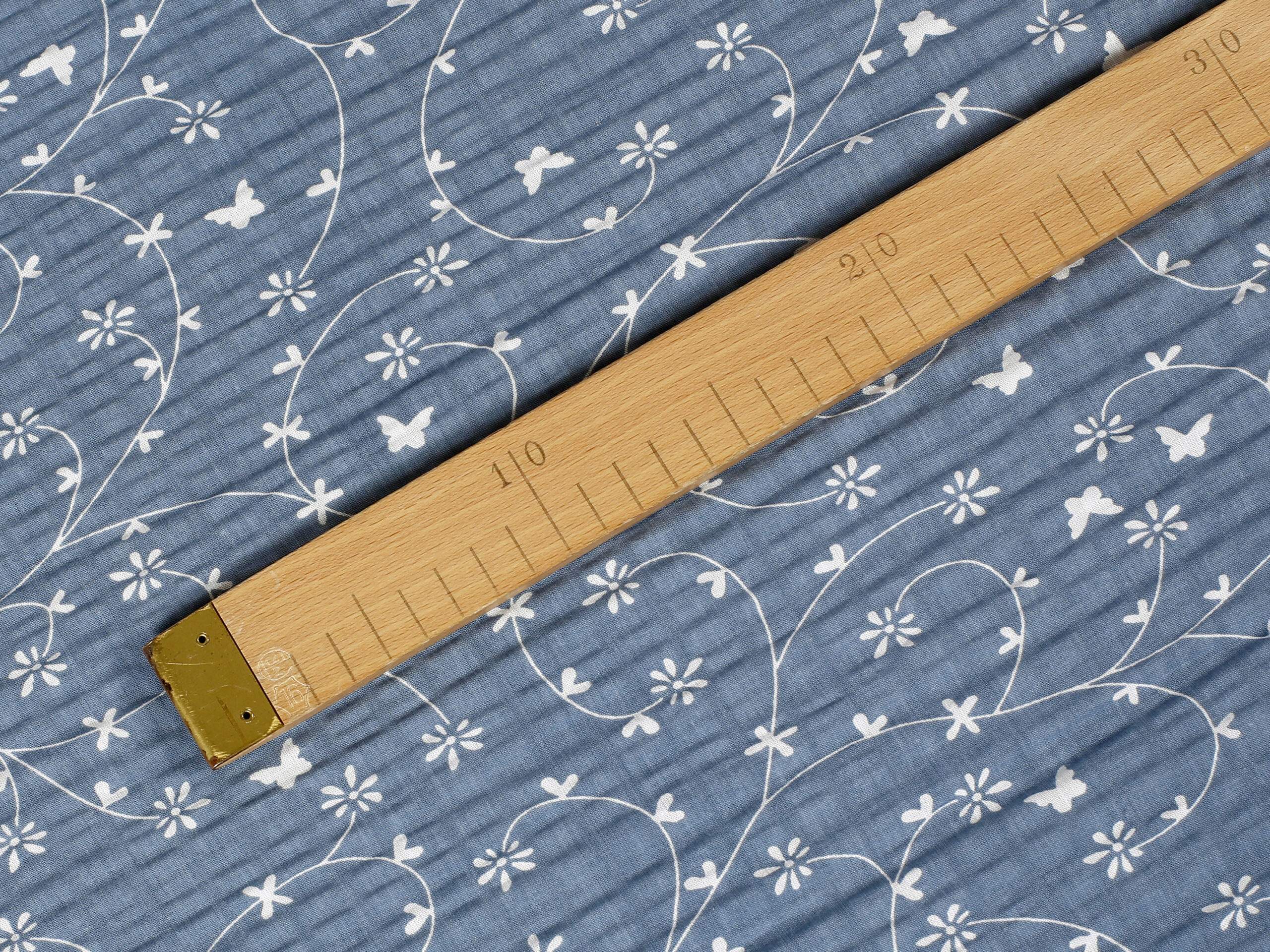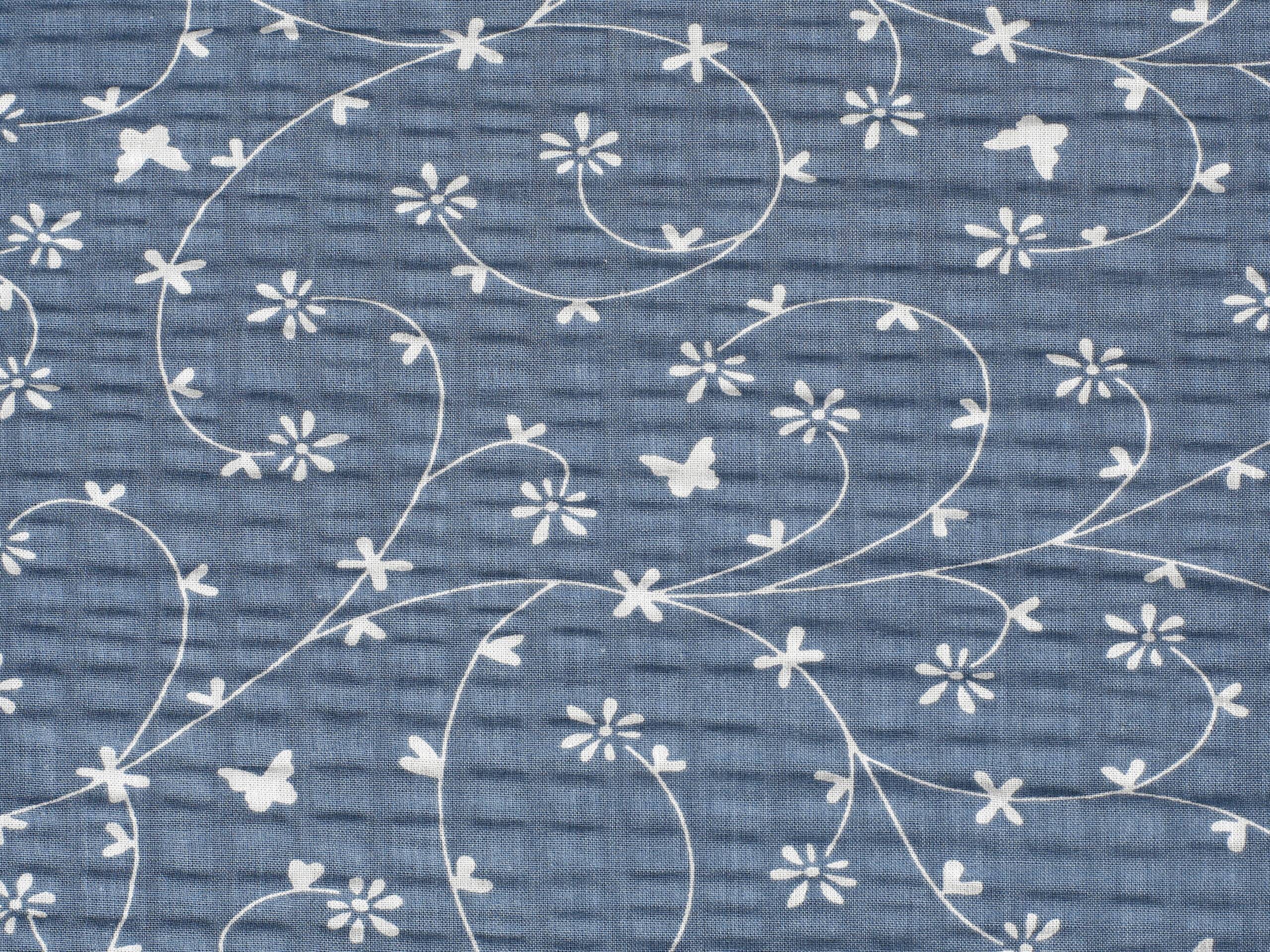 Naše dětská krepová látka bílí motýlci na modré značky Škodák, je vyrobená z měkčené 100% bavlny s gramáží 145g/m2 a šířce 145 cm.