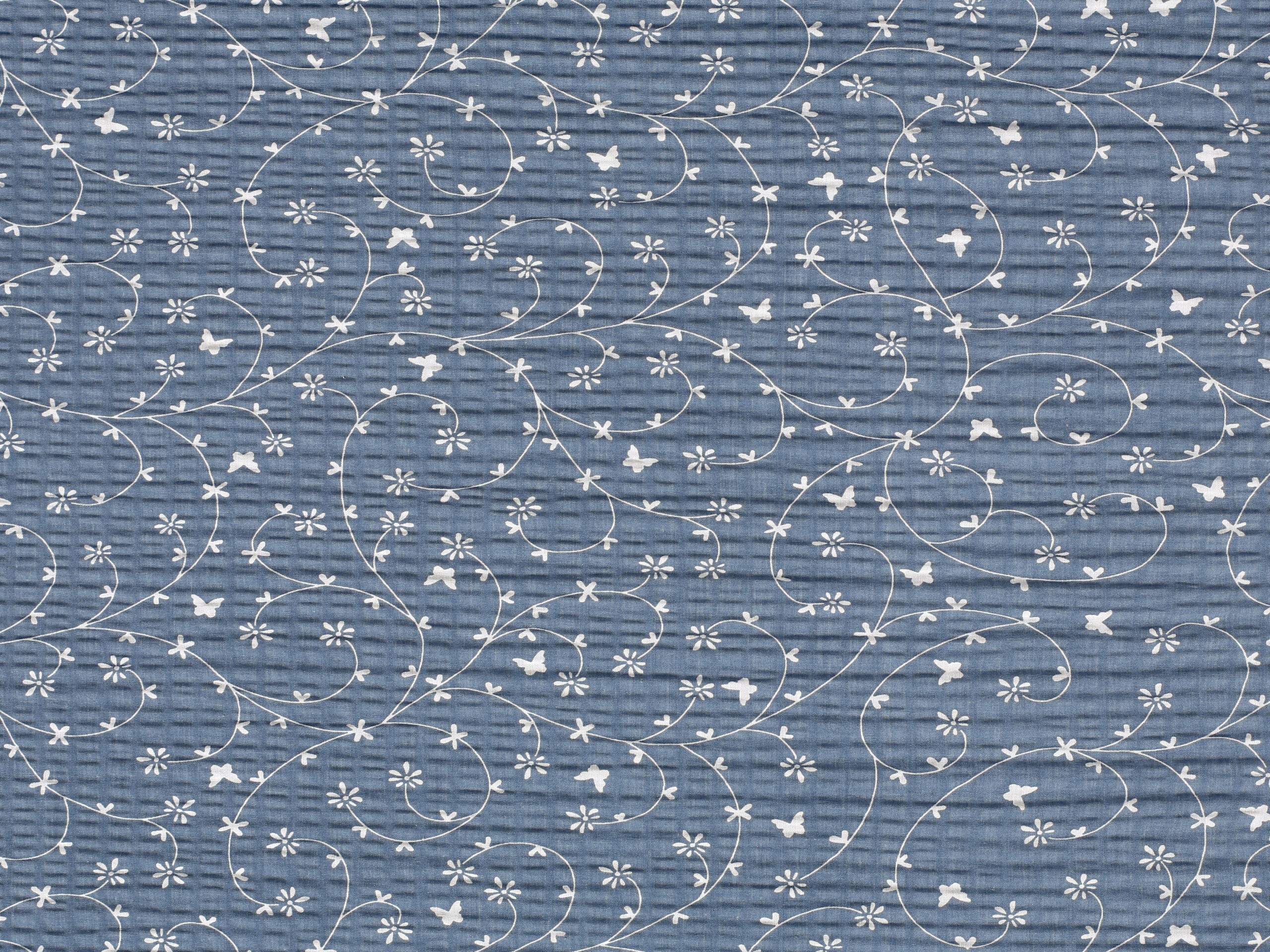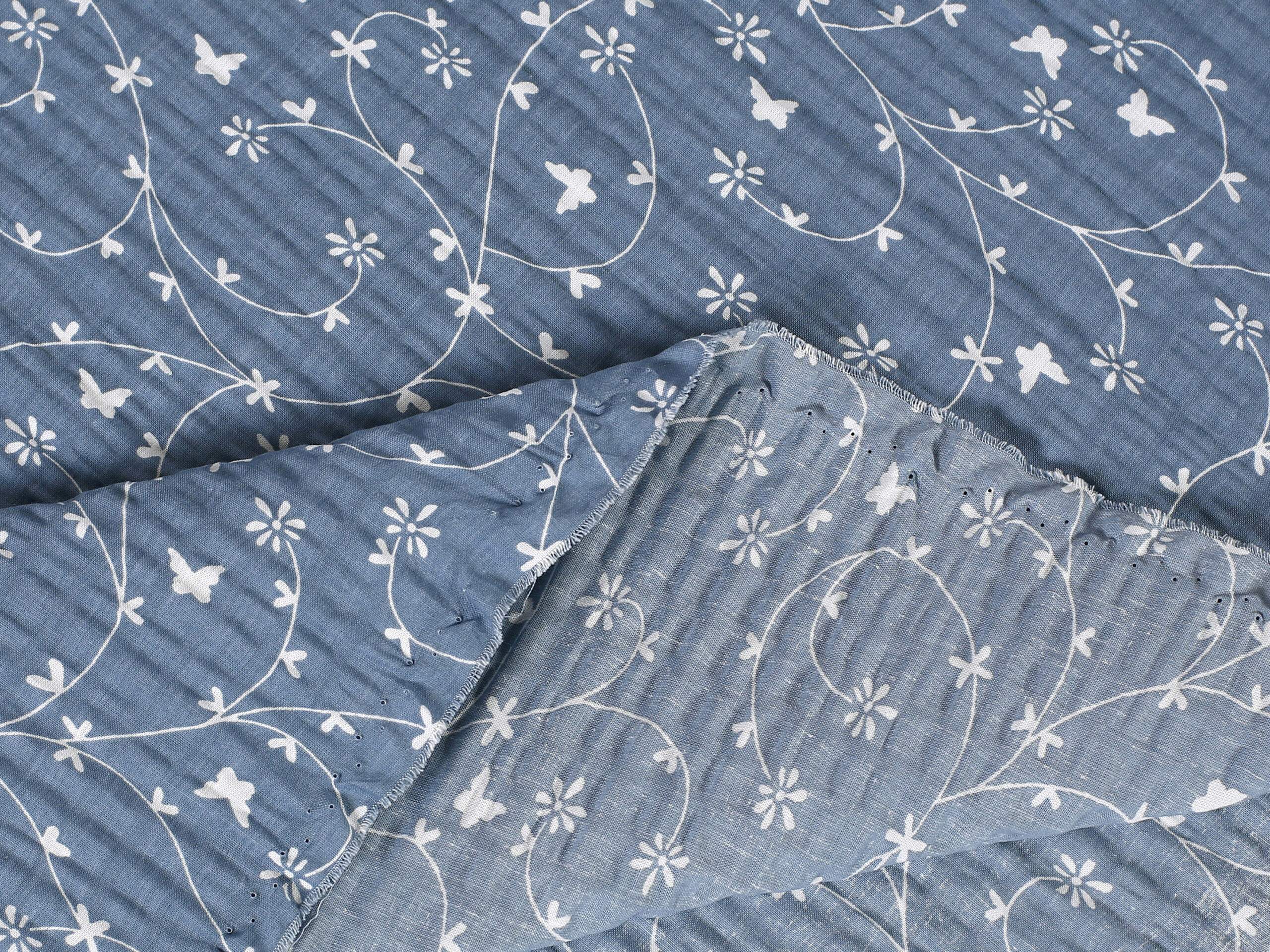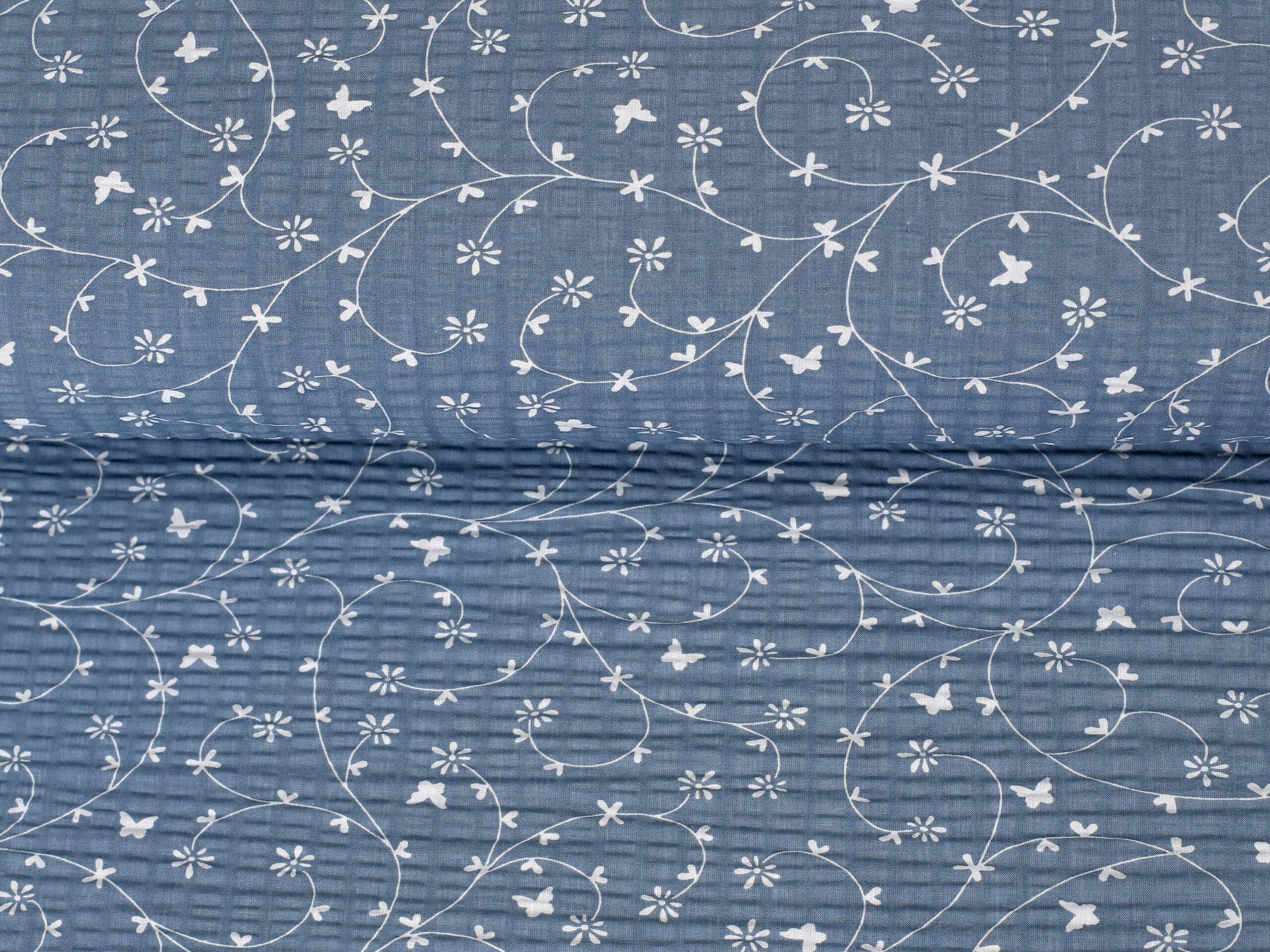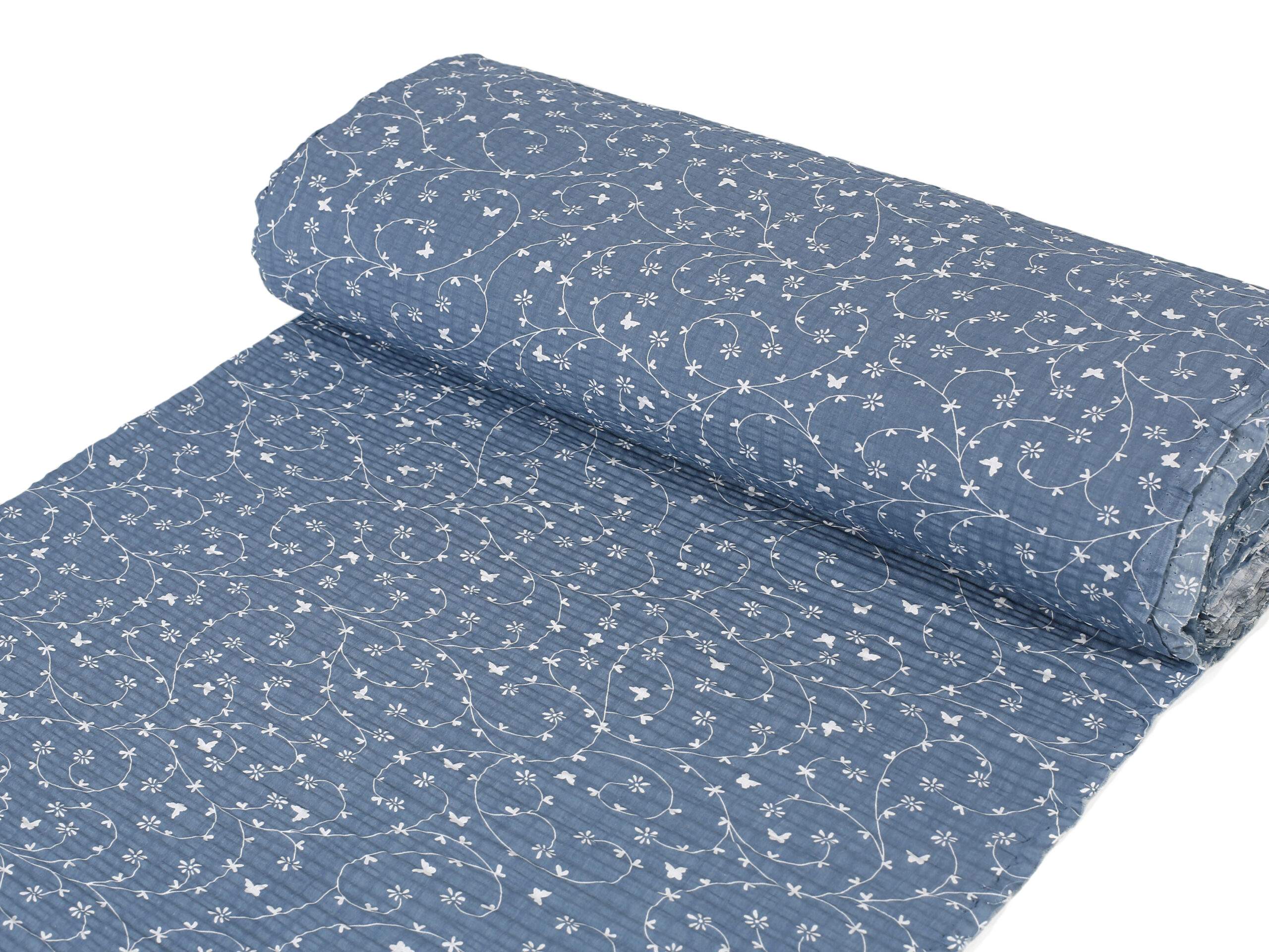 Naše dětská krepová látka bílí motýlci na modré značky Škodák, je vyrobená z měkčené 100% bavlny s gramáží 145g/m2 a šířce 145 cm.
