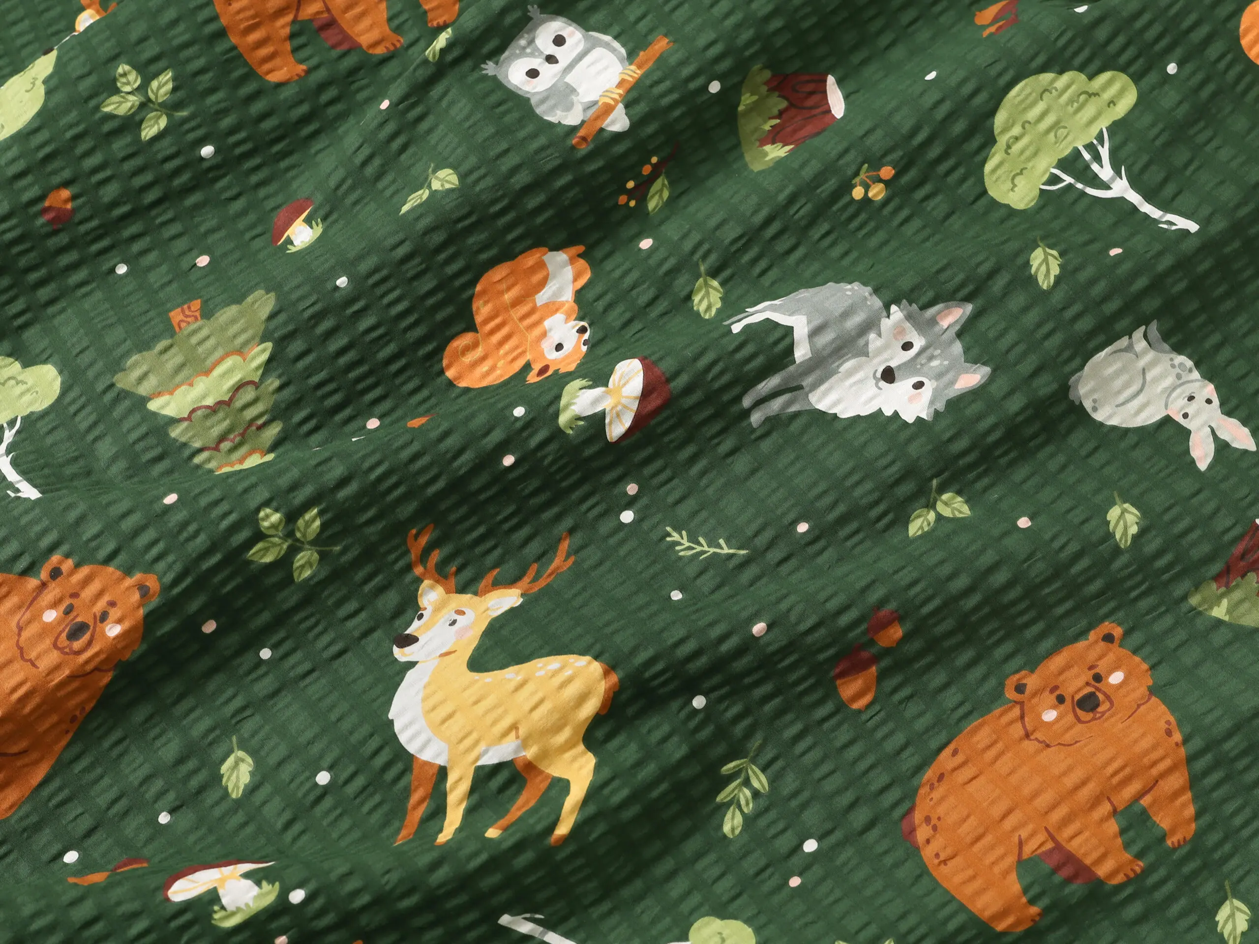 Naše dětská krepová látka Řáholecký les na tmavě zelené značky Škodák, je vyrobená z měkčené 100% bavlny s gramáží 145g/m² a šířce 142 cm.