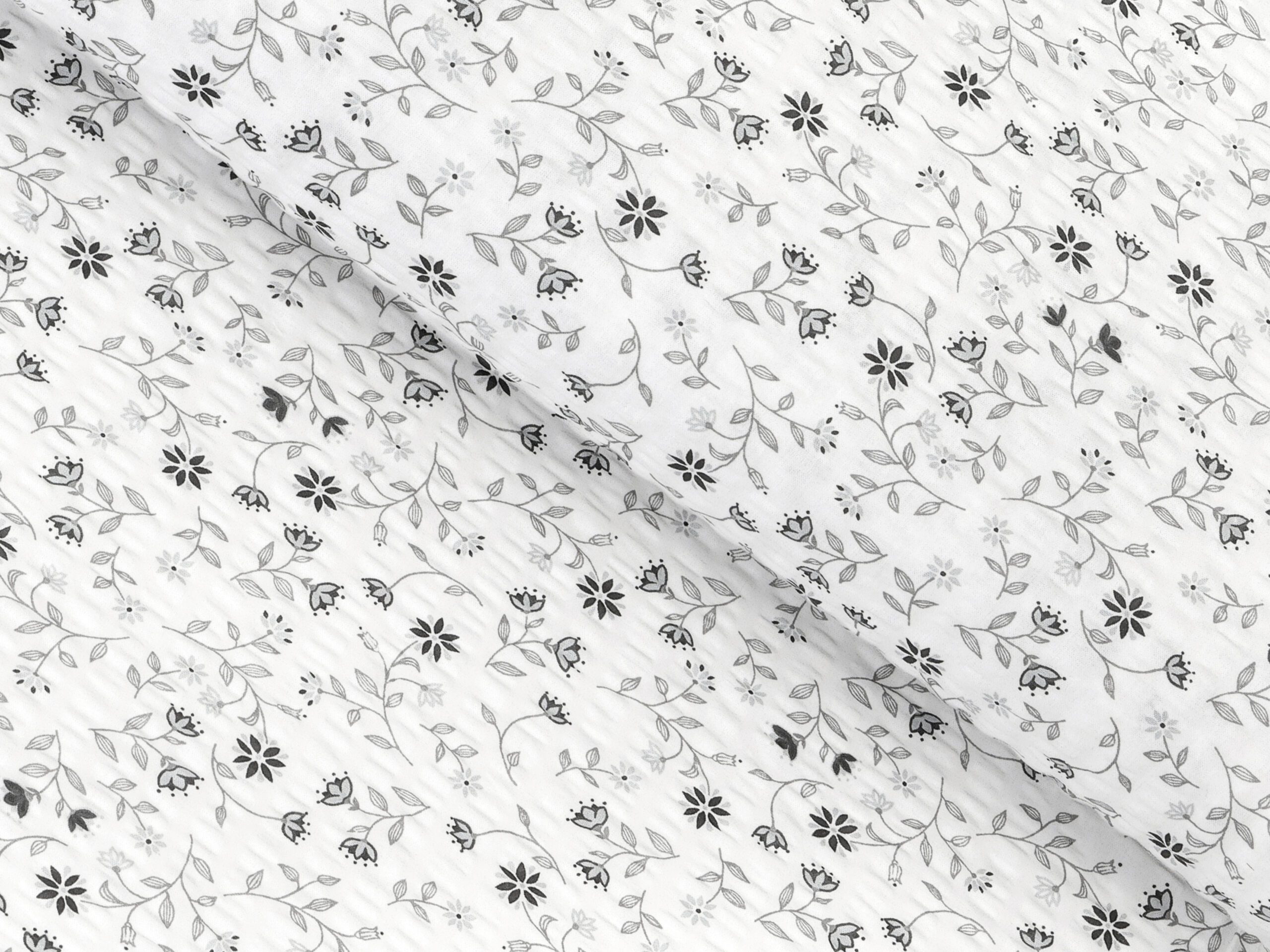 Krepová látka – šedé kvítko na bílé – metráž šířka 142 cm