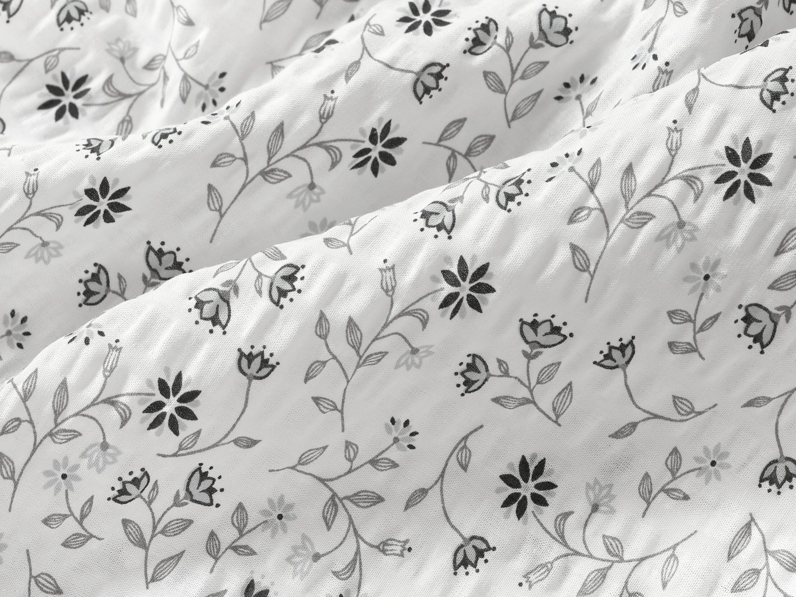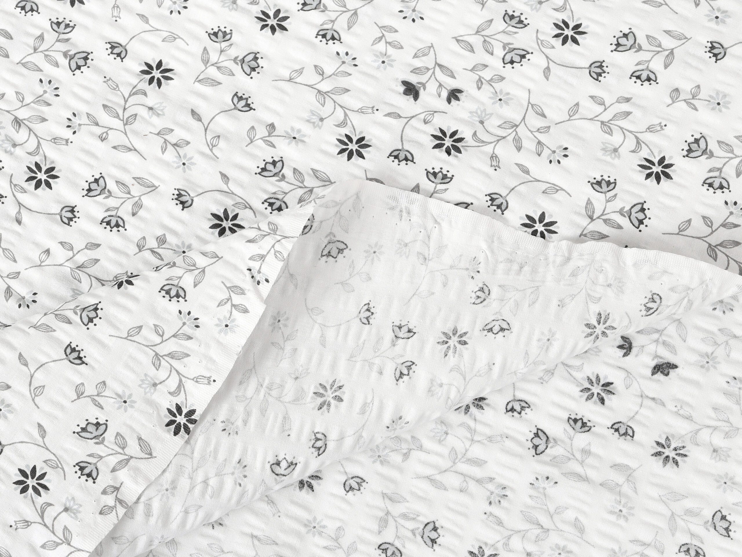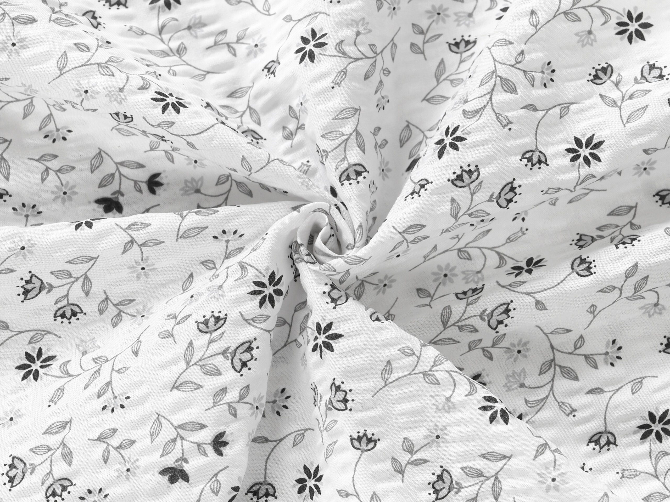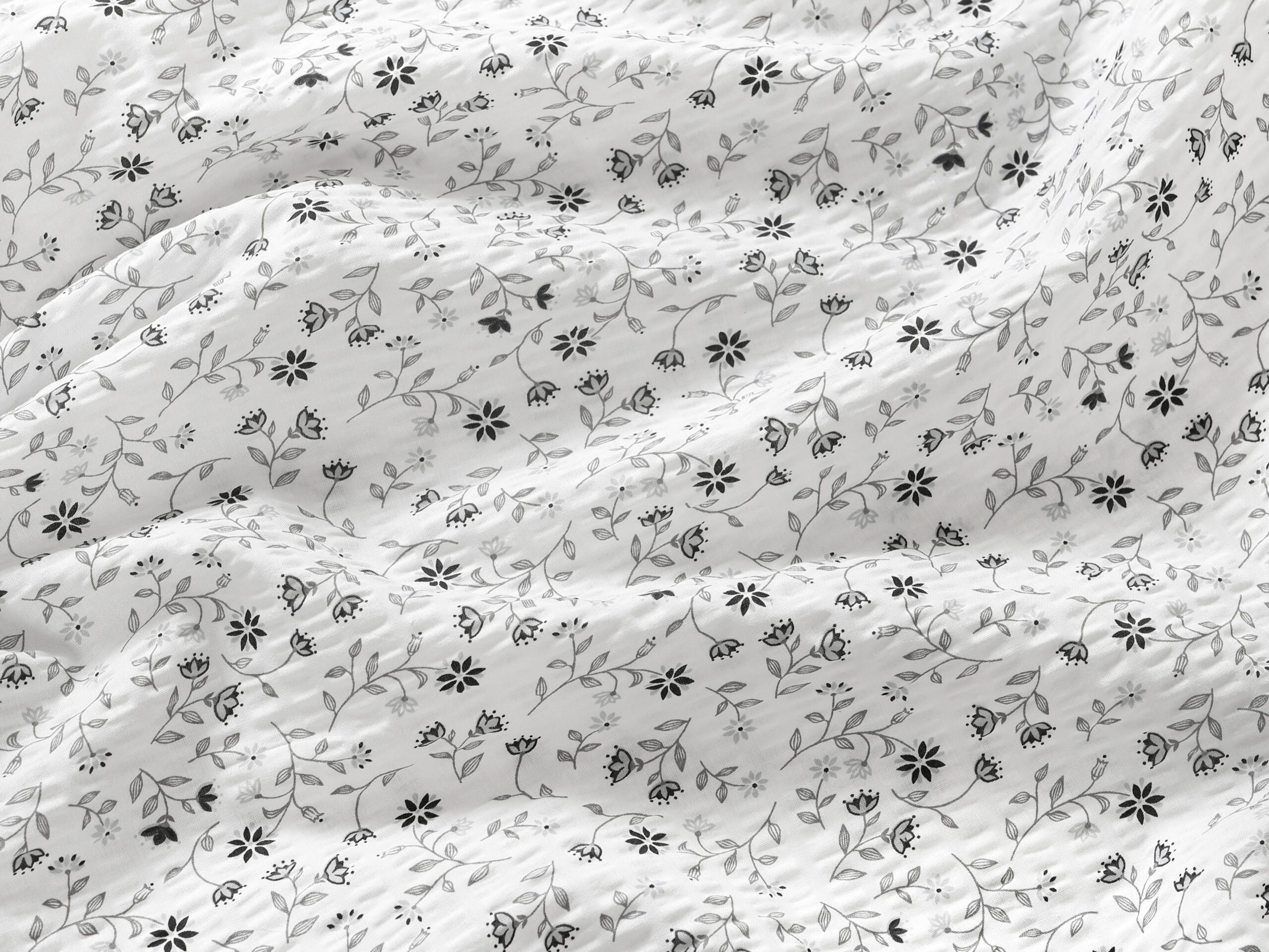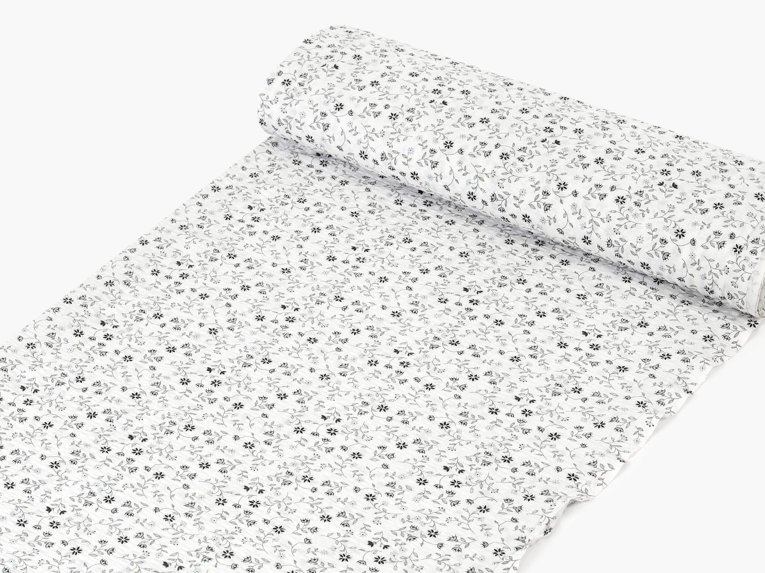 Krásný moderní vzor šedého kvítí na bílém pozadí rozzáří Váš pokoj, objevte naše krepové povlečení.