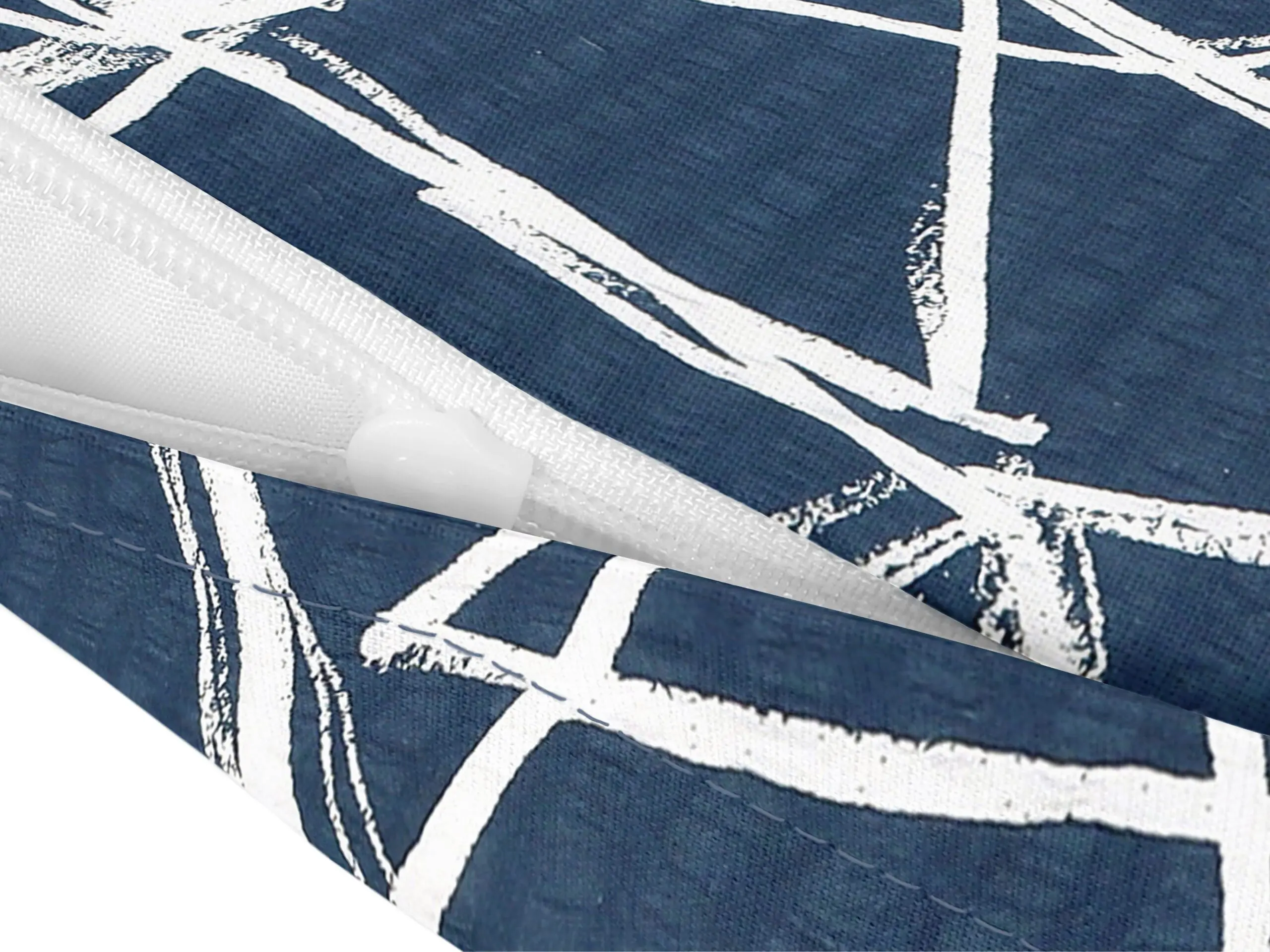 Pro maximální pohodlí vám nabízíme také výplňové polštáře, které jsou ideálním doplňkem k našemu krepovému povlaku. Tento povlak má moderní motiv bílých trojúhelníků na podkladové modré barvě.