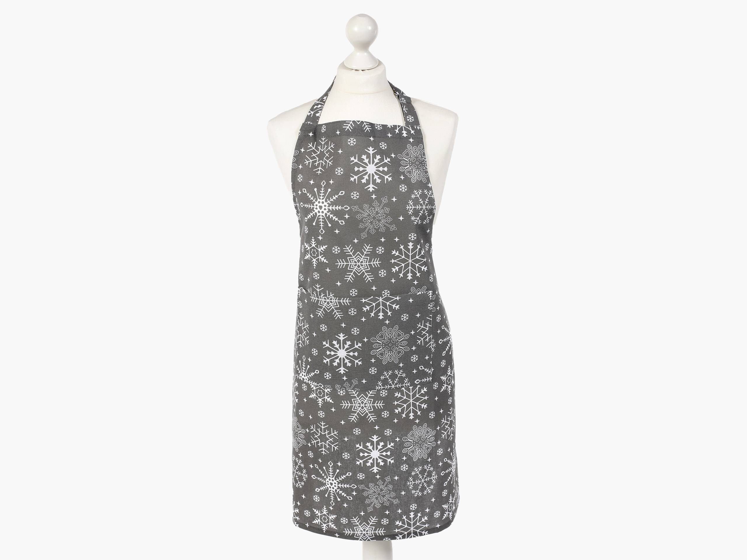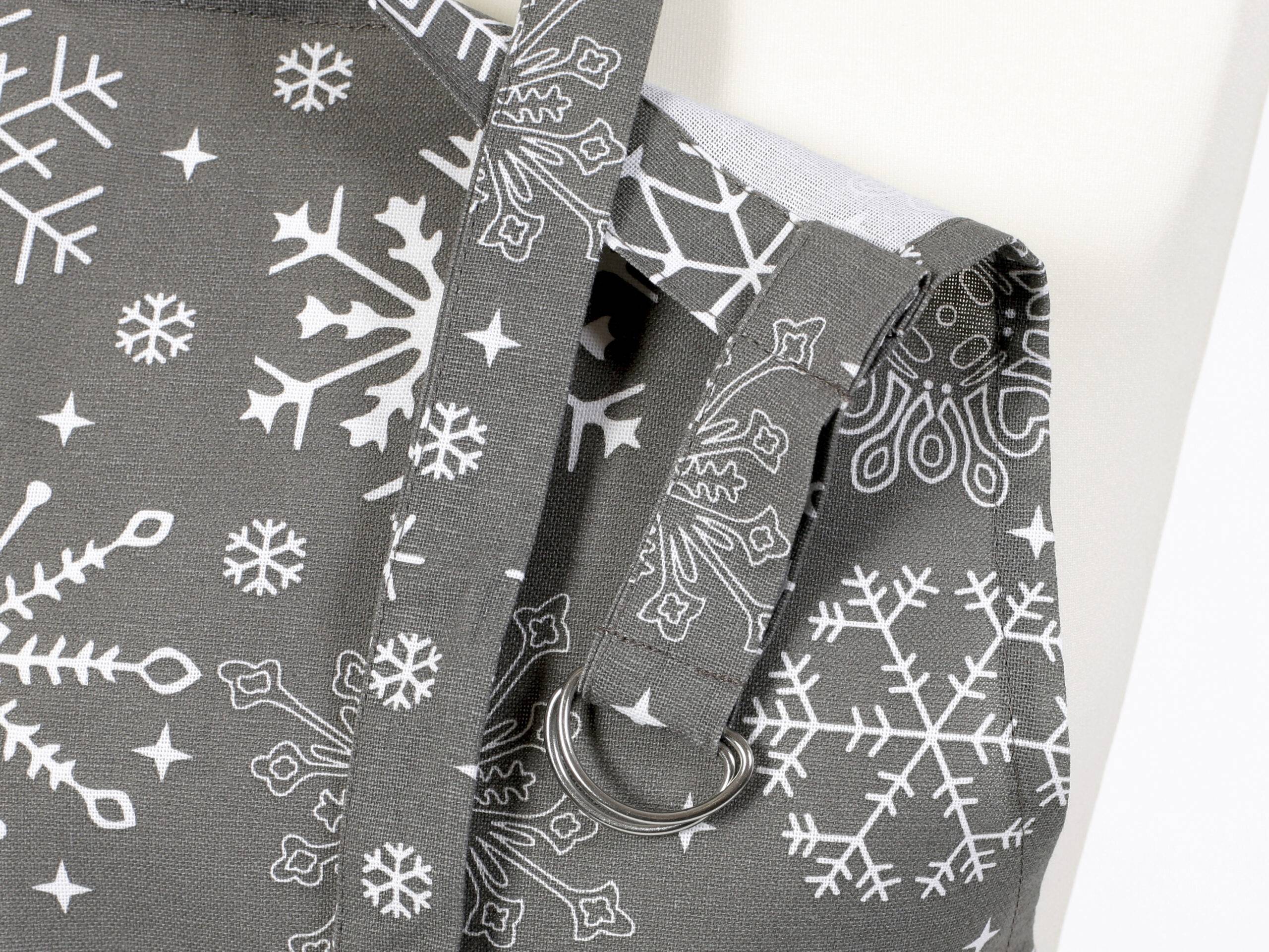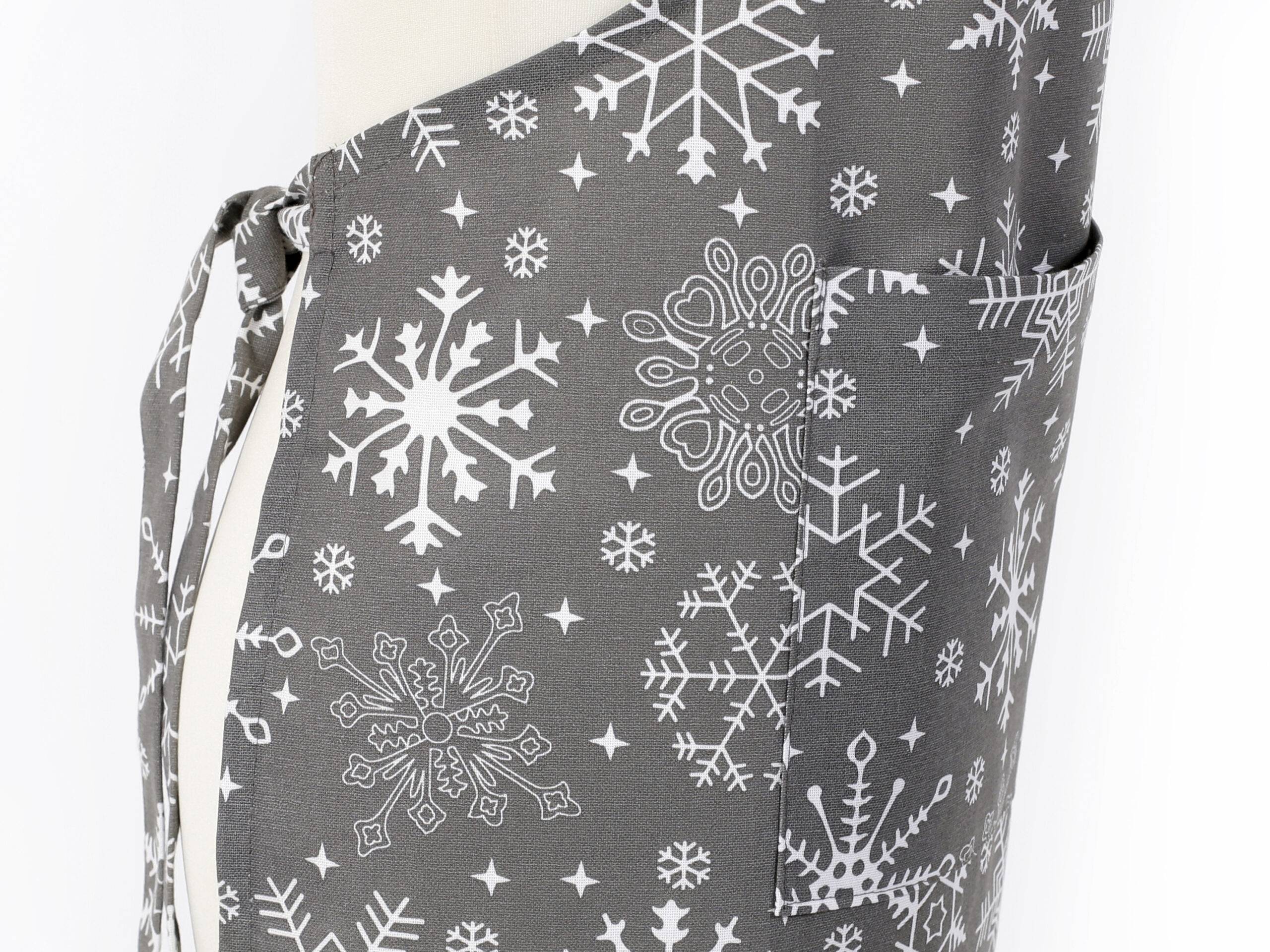 Pohodlná kuchyňská zástěra Terra vločky na šedé barvě je ideální volbou do Vaší kuchyně.