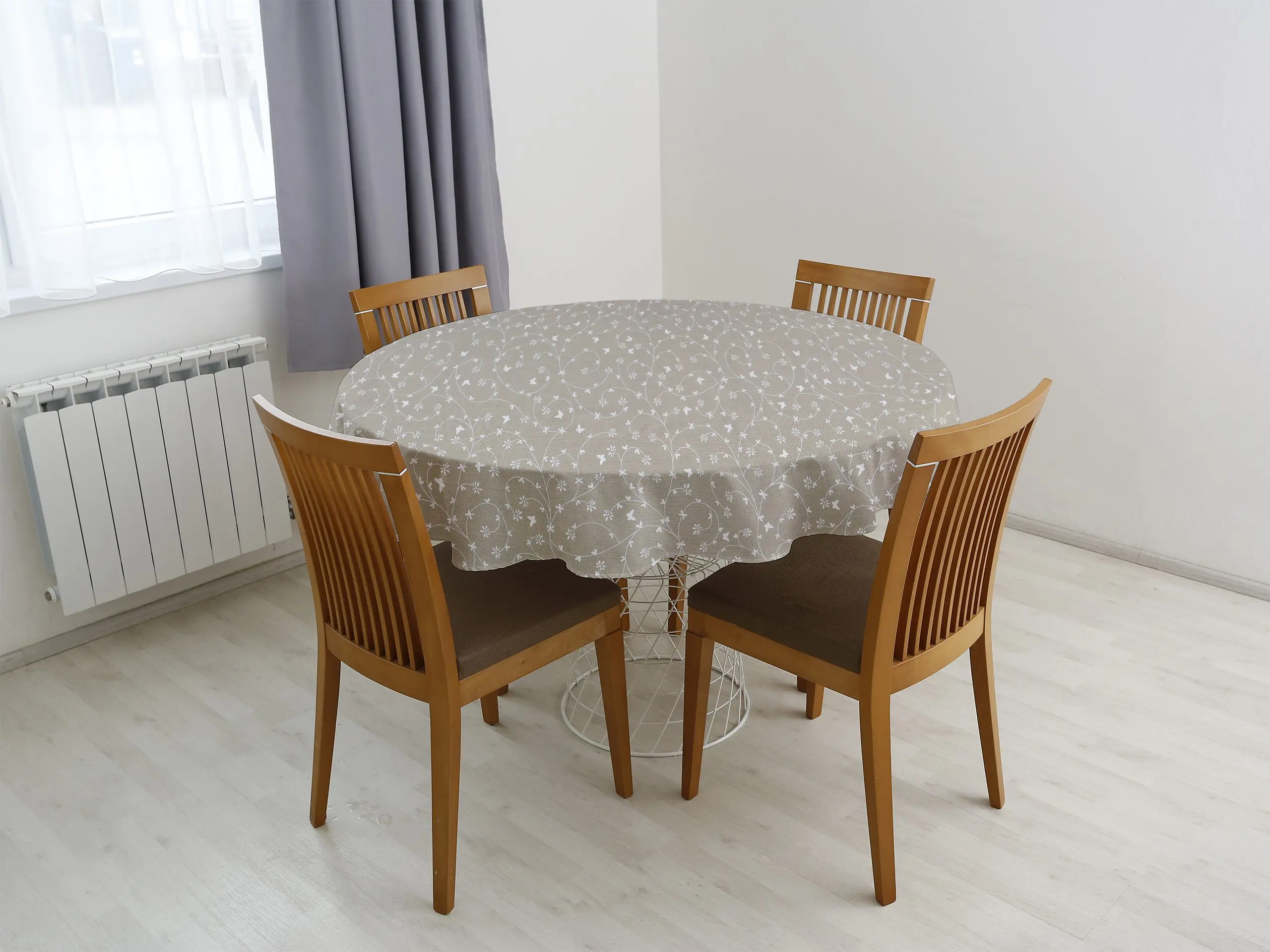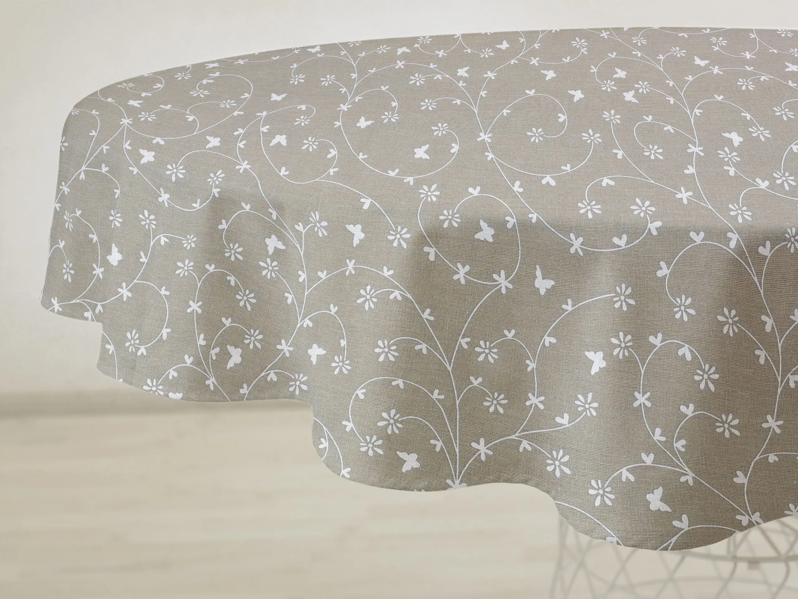Kulatý bavlněný ubrus – bílé kytičky na béžové
