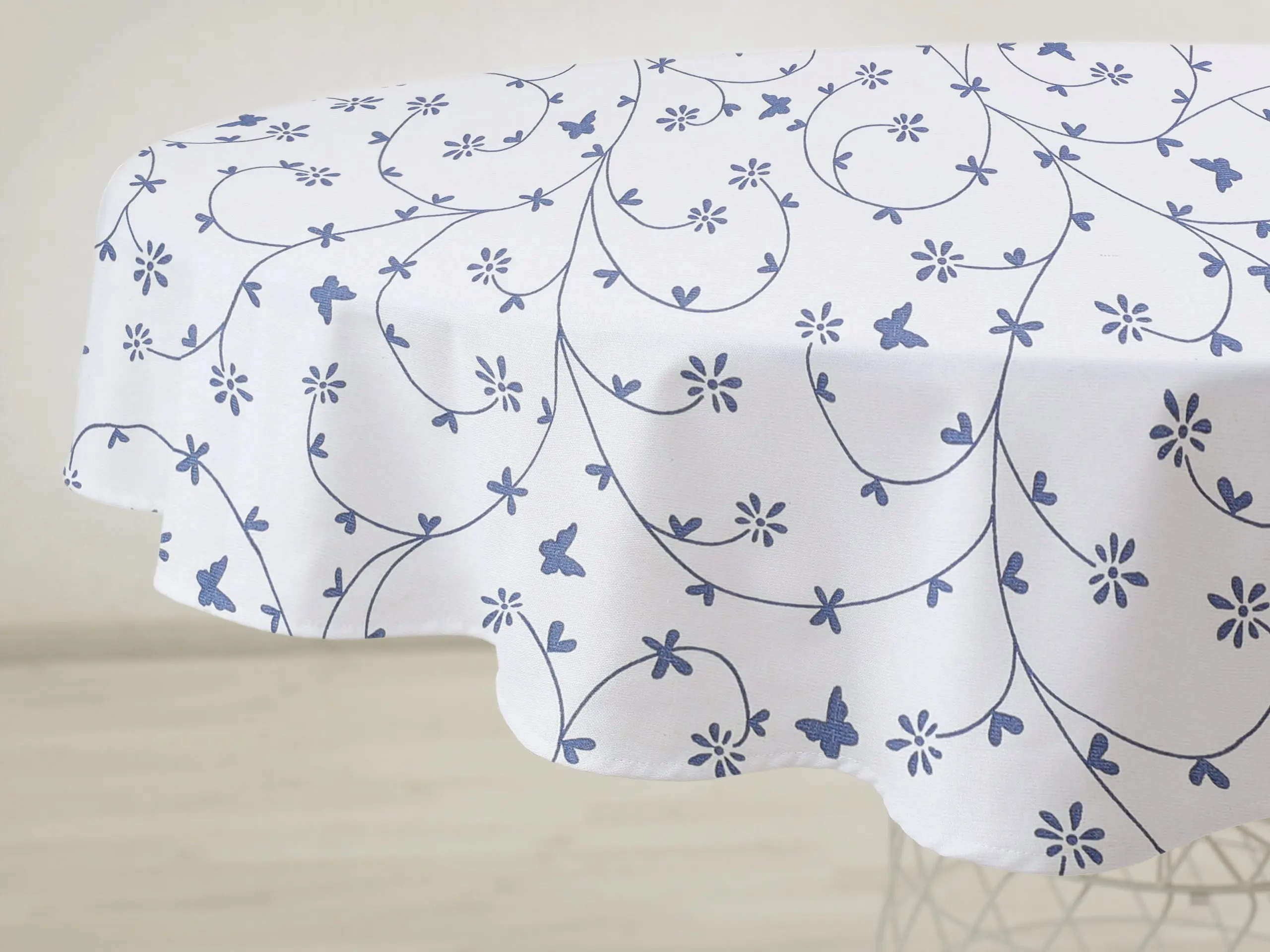 Kulatý bavlněný ubrus se vzorem modrých kytiček na bílé je ideální volbou pro ty, kteří hledají kombinaci elegance a funkčnosti. Dejte svému stolu šmrnc s tímto nádherným květinovým ubrusem, který je skvělým doplňkem pro každou příležitost. Skvělá investice pro váš jídelní stůl. Ubrus se skvěle hodí pro každodenní použití.