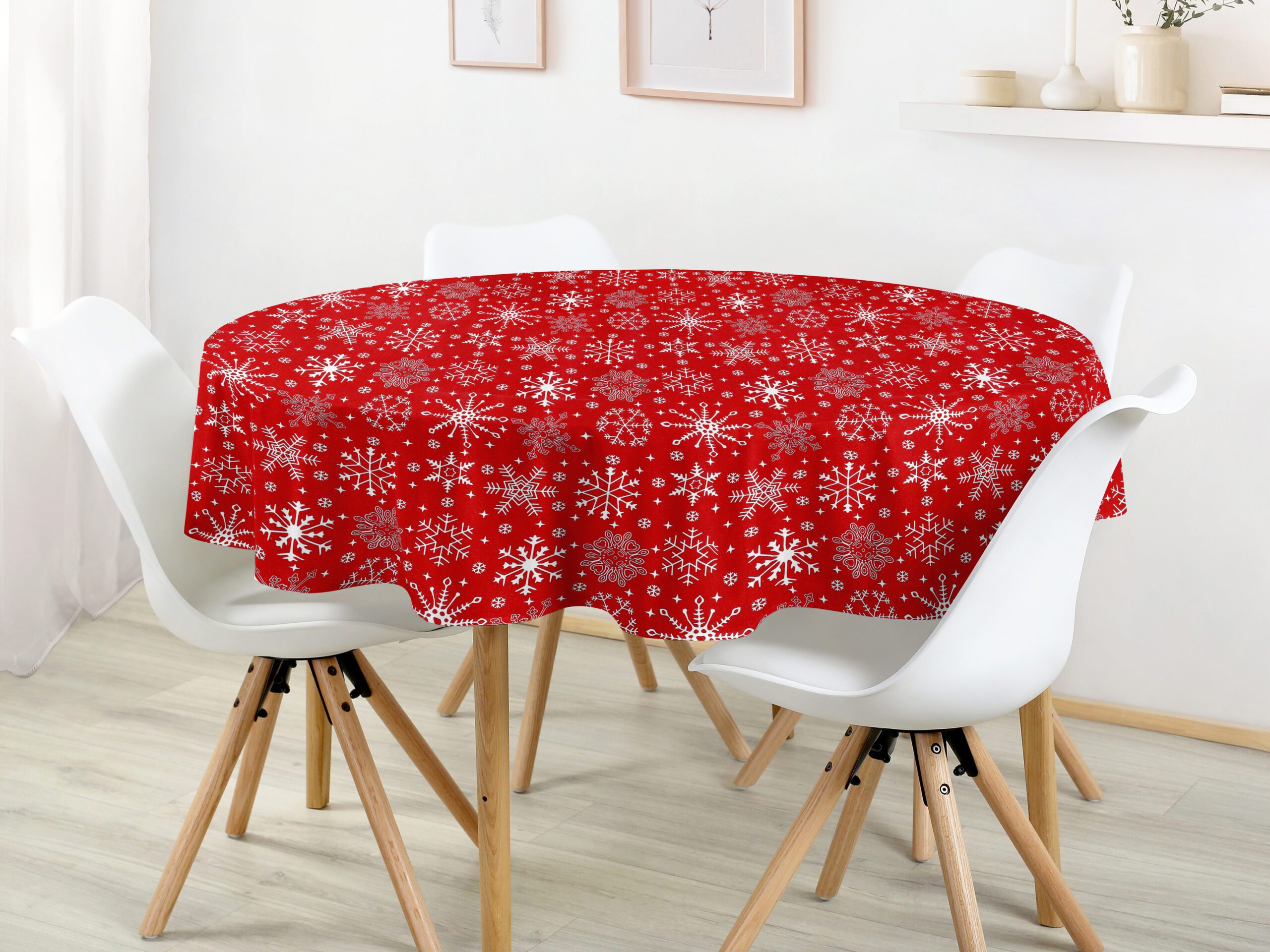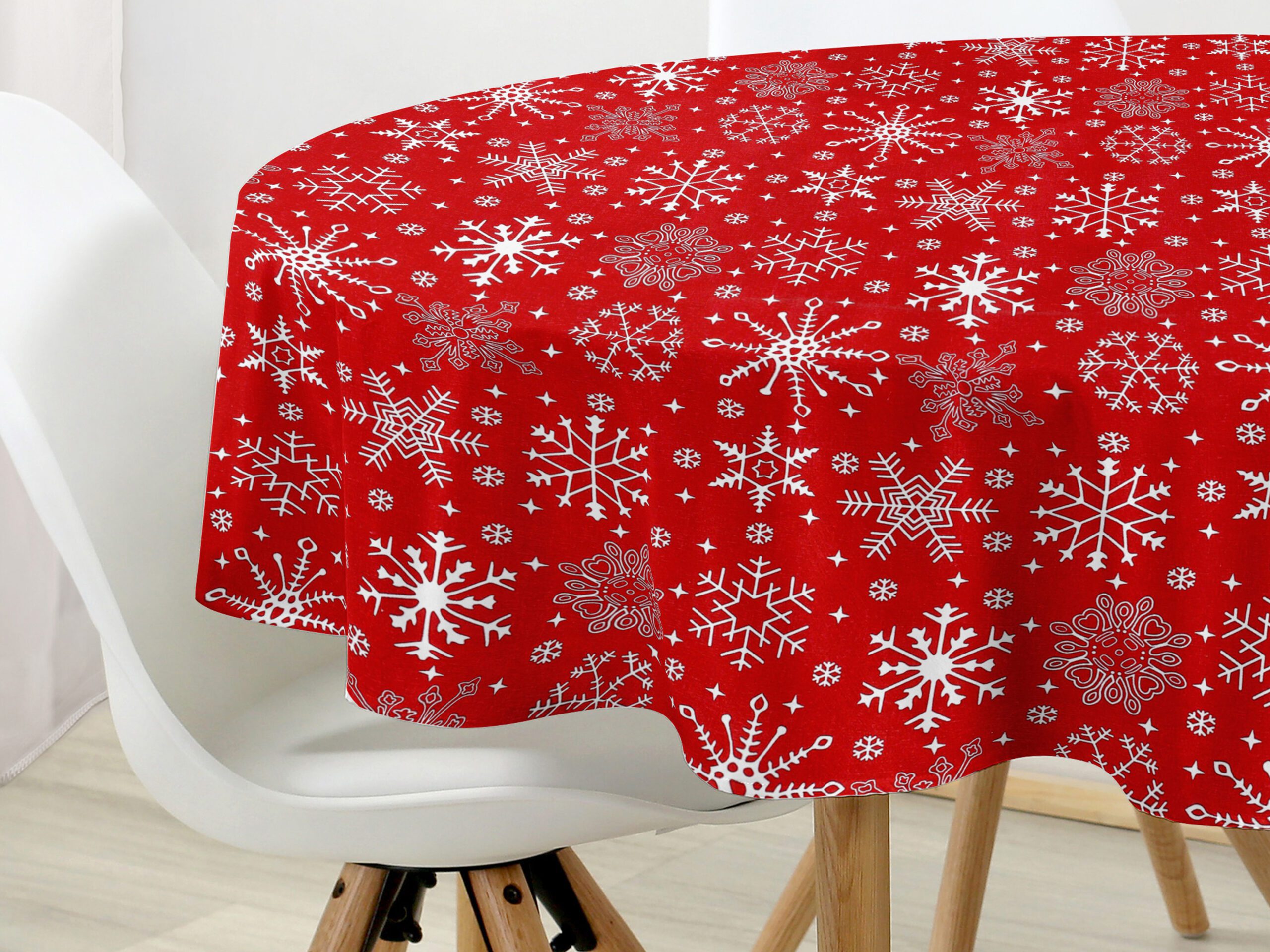 Kulatý bavlněný ubrus s vločkami na červené je ideální volbou pro ty, kteří hledají kombinaci elegance a funkčnosti. Dejte svému vánočnímu stolu šmrnc s tímto nádherným ubrusem, který je skvělým doplňkem pro vánoční svátky. Skvělá investice pro váš jídelní stůl.