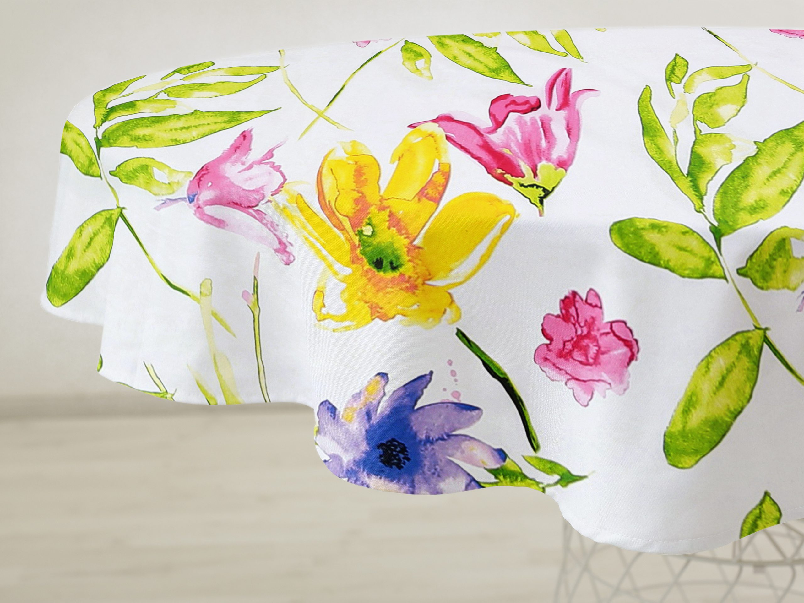 Kulatý bavlněný ubrus se vzorem barevných květů je ideální volbou pro ty, kteří hledají kombinaci elegance a funkčnosti. Dejte svému stolu šmrnc s tímto nádherným květinovým ubrusem, který je skvělým doplňkem pro každou příležitost. Skvělá investice pro váš jídelní stůl. Ubrus se skvěle hodí pro každodenní použití.