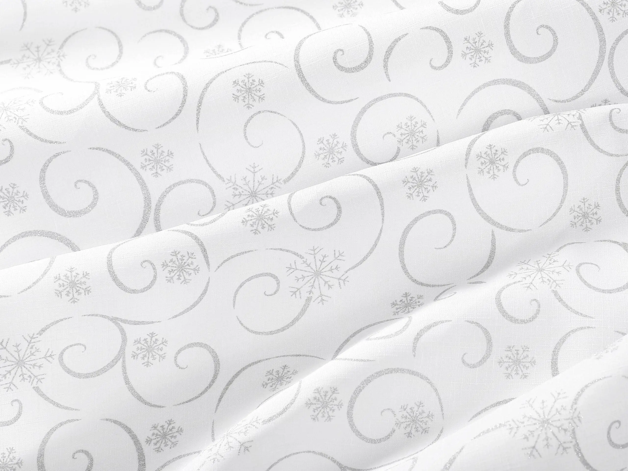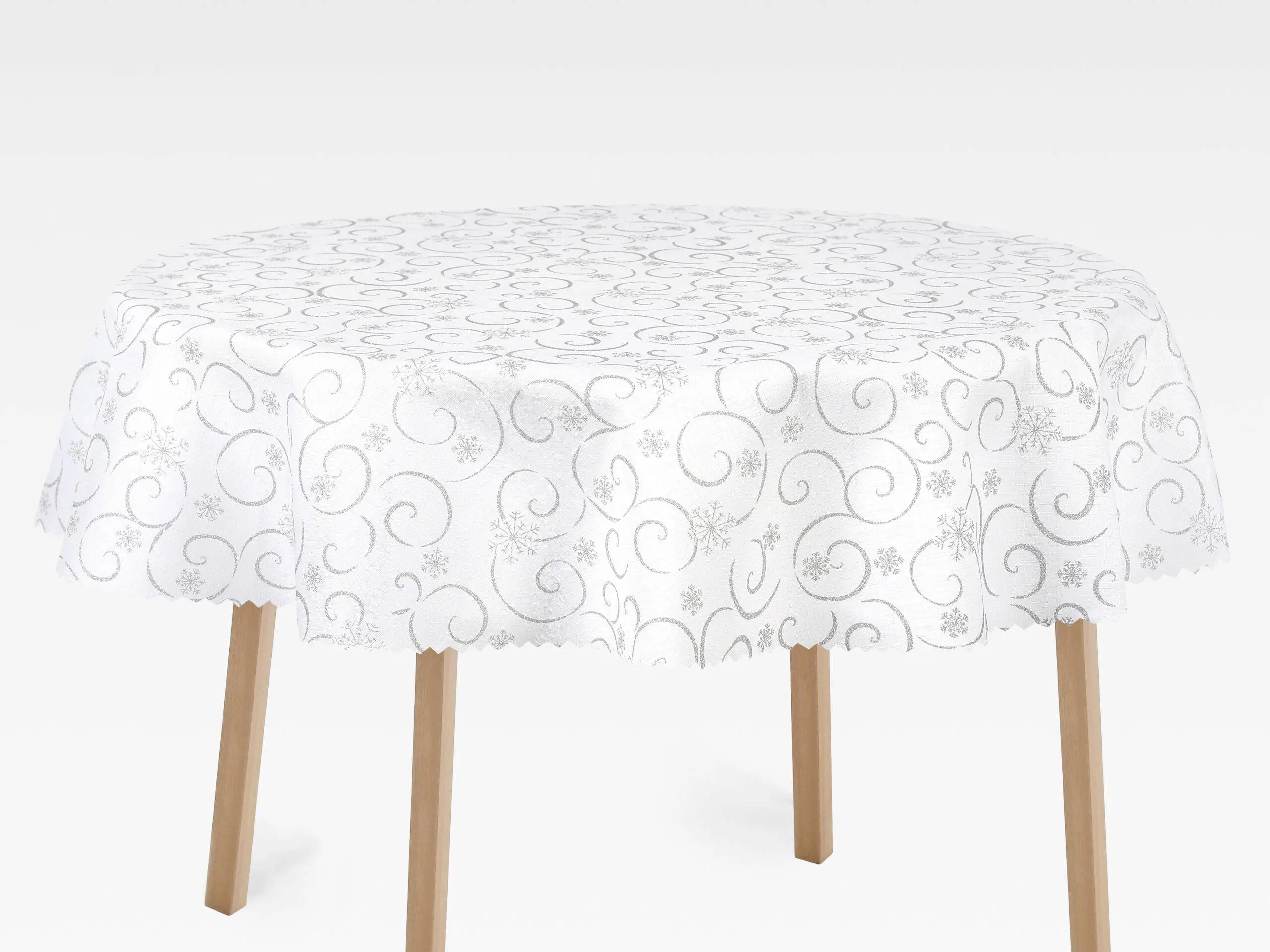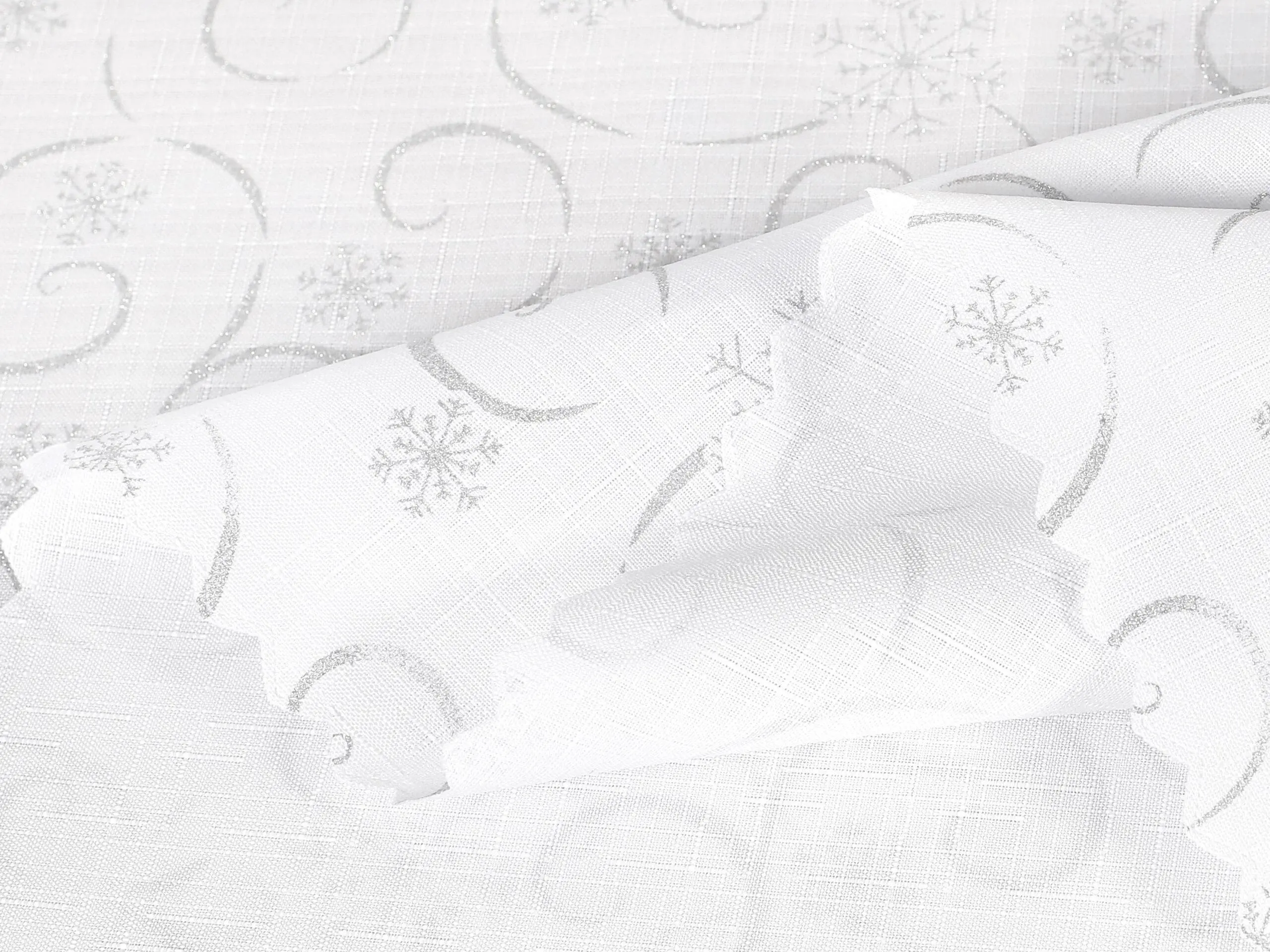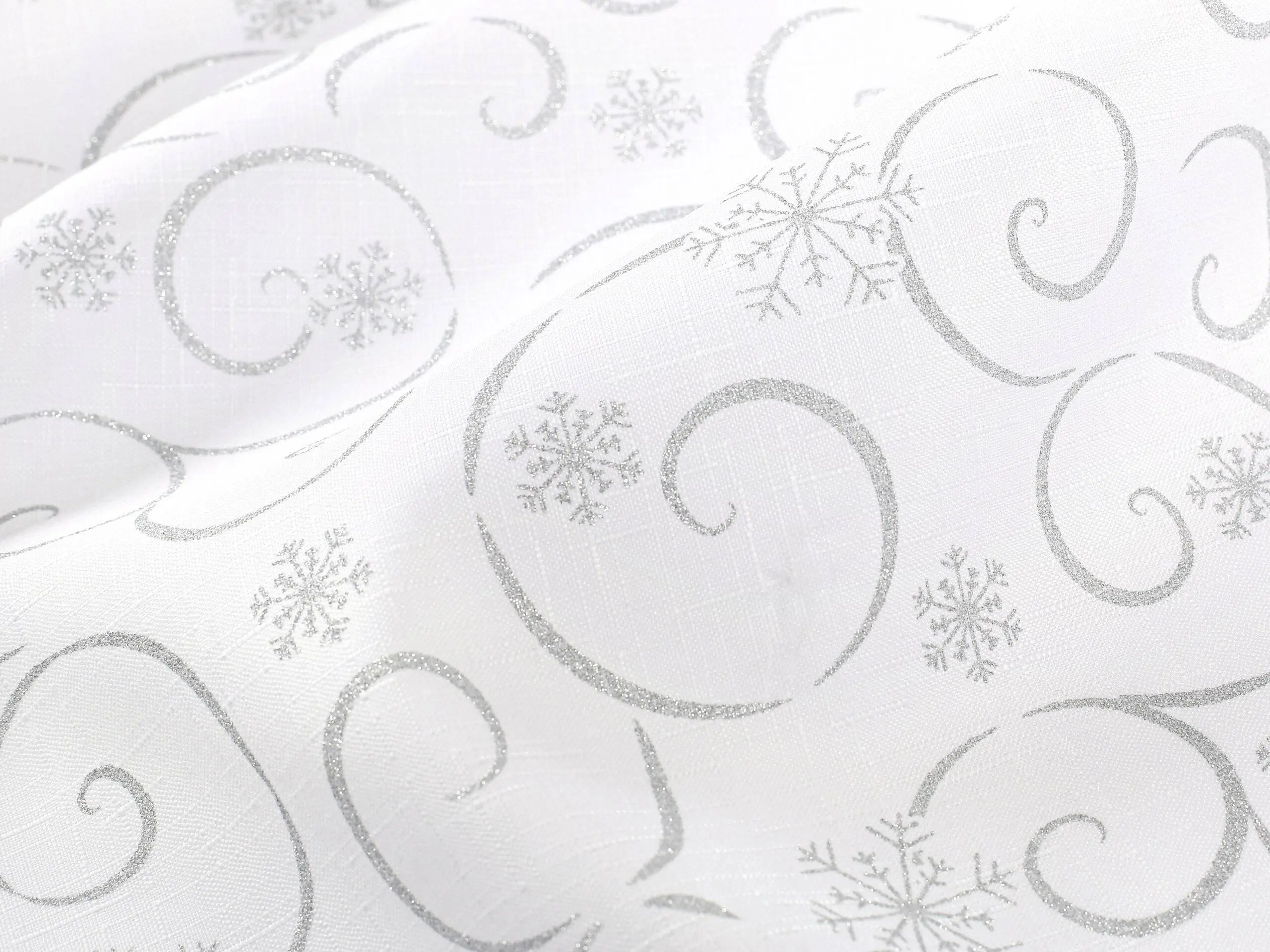 - 100% polyester: Tento bílý ubrus se vzorem stříbrných vloček je vyroben z pevného a odolného polyesteru, který vydrží dlouhé roky.