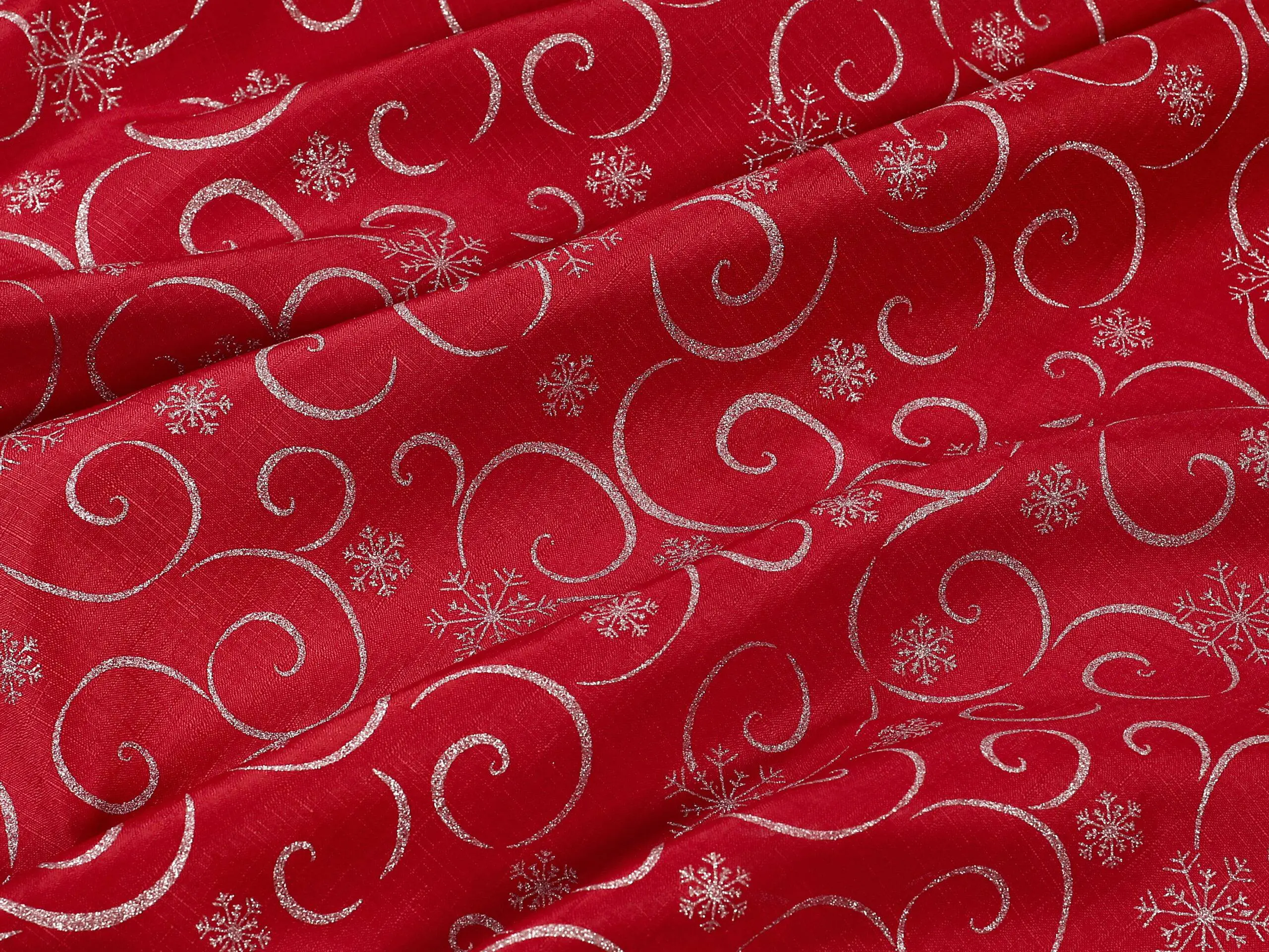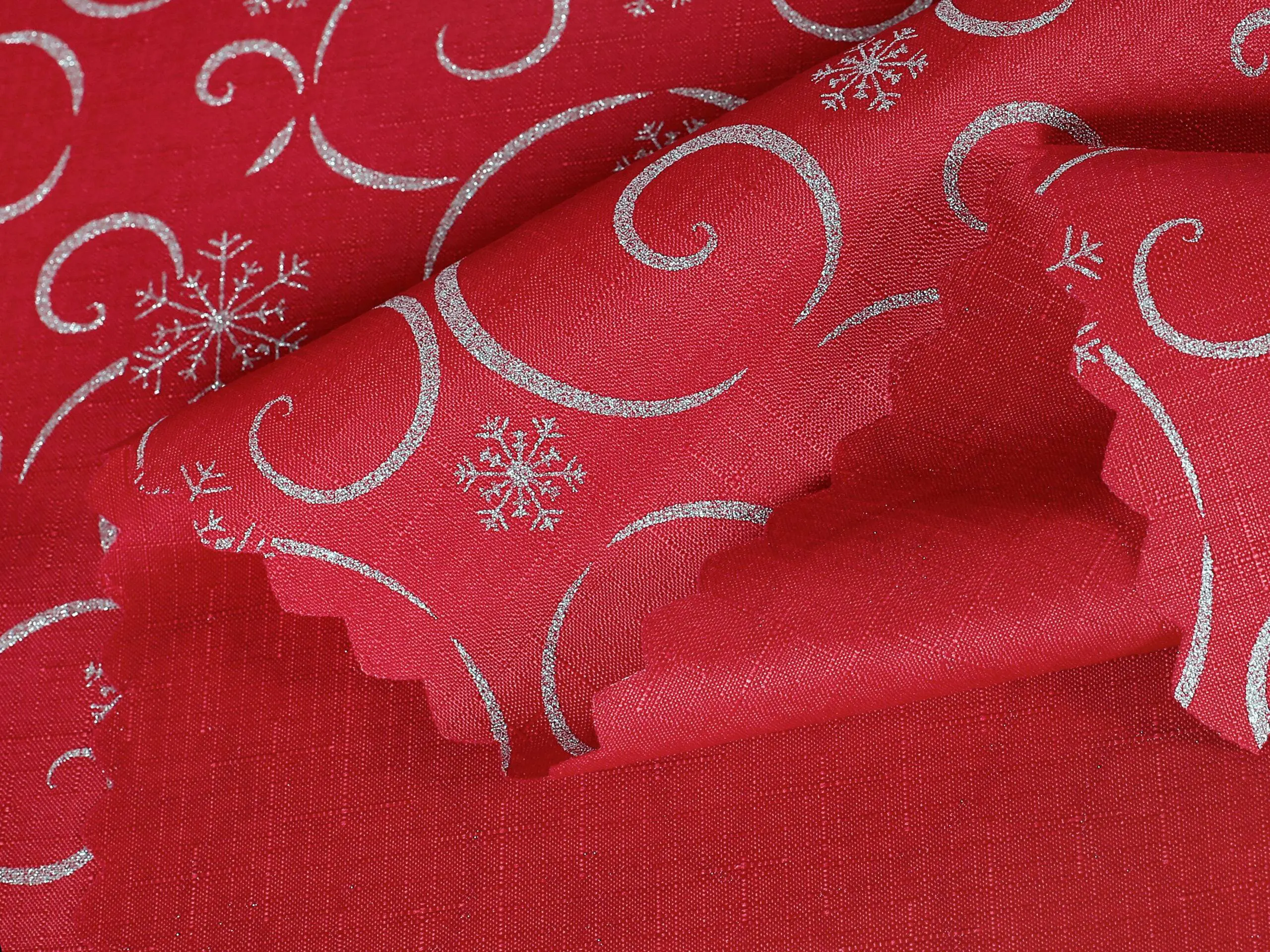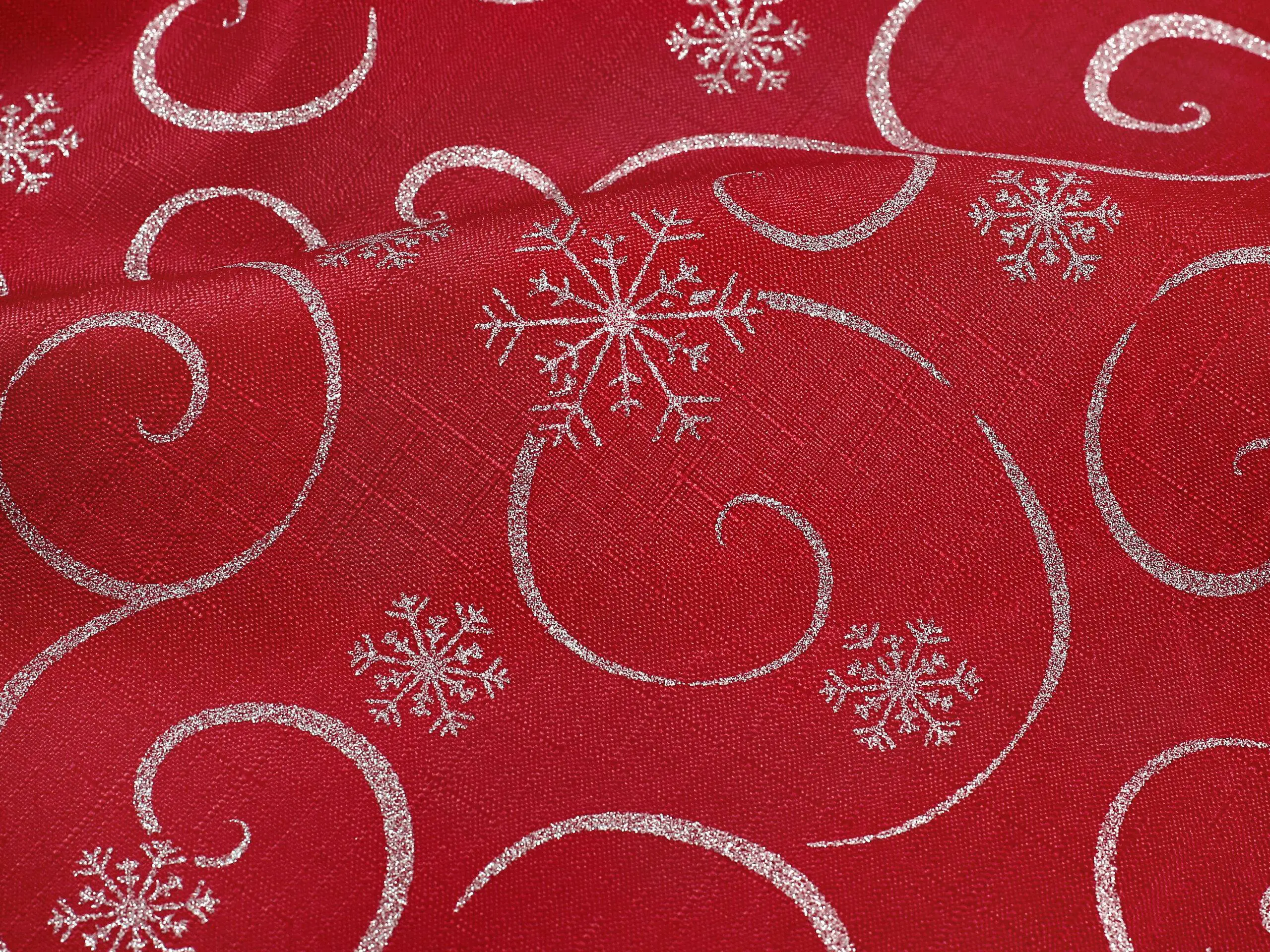 - 100% polyester: Tento červený ubrus se vzorem stříbrných vloček je vyroben z pevného a odolného polyesteru, který vydrží dlouhé roky.