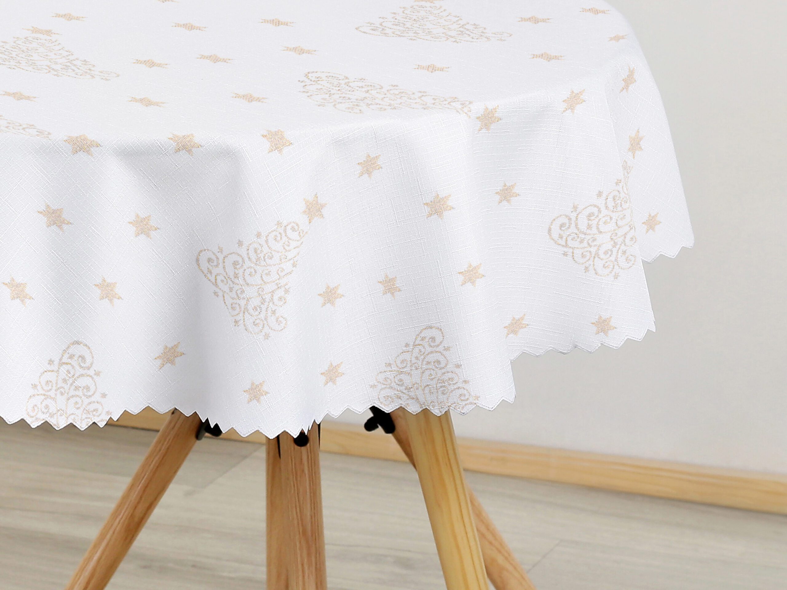 - 100% polyester: Tento bílý ubrus se vzorem zlatých stromečků je vyroben z pevného a odolného polyesteru, který vydrží dlouhé roky.