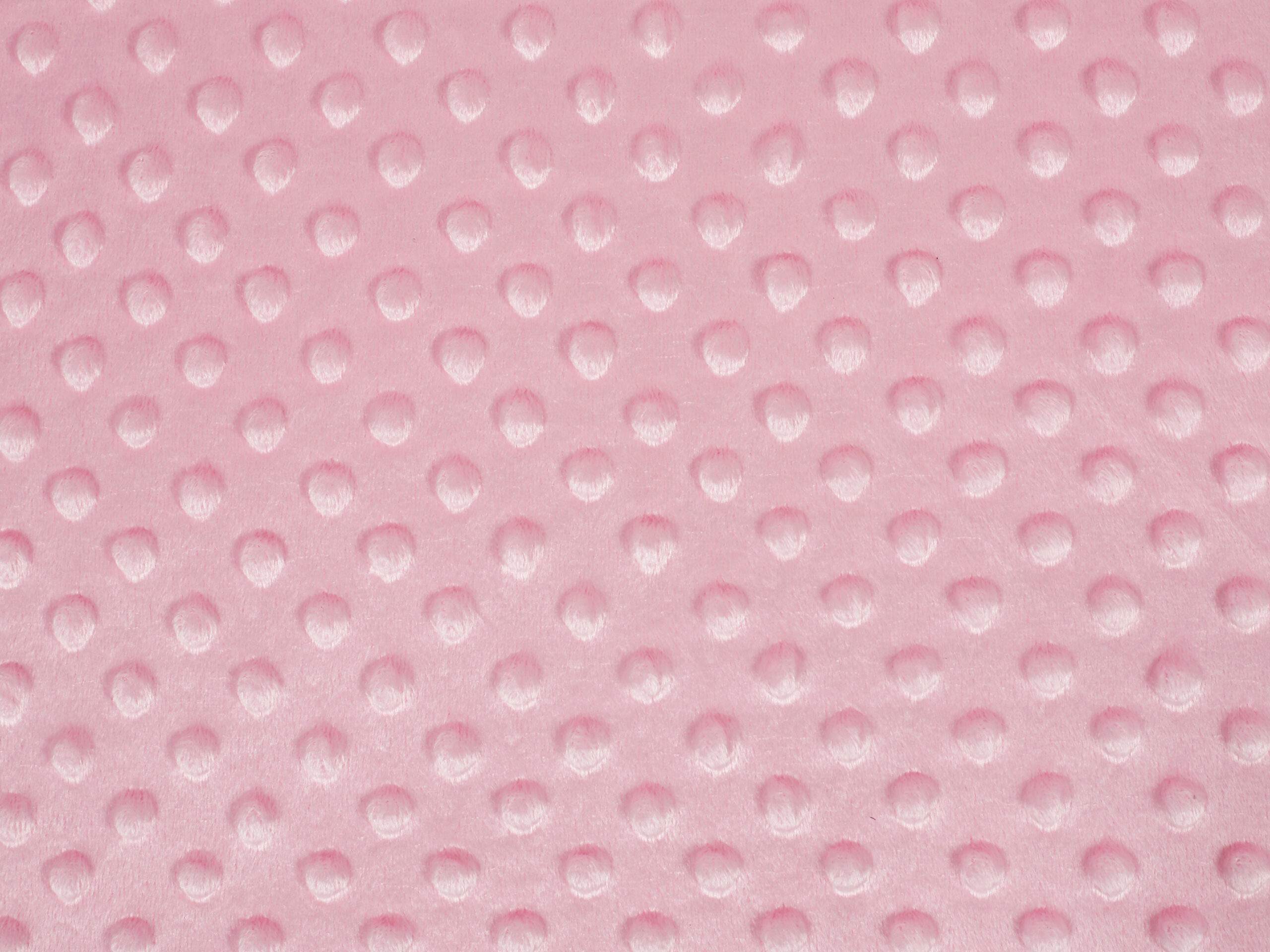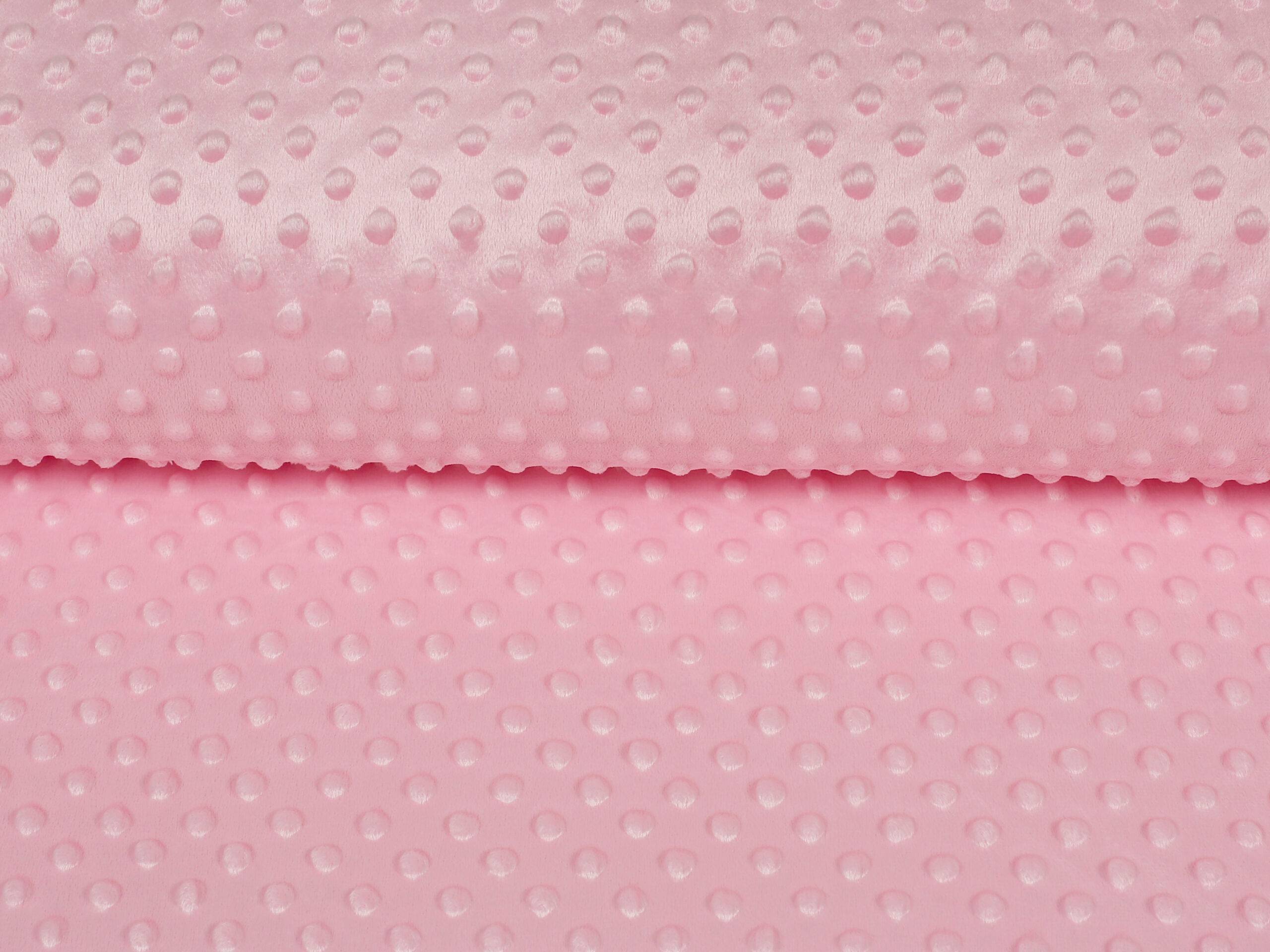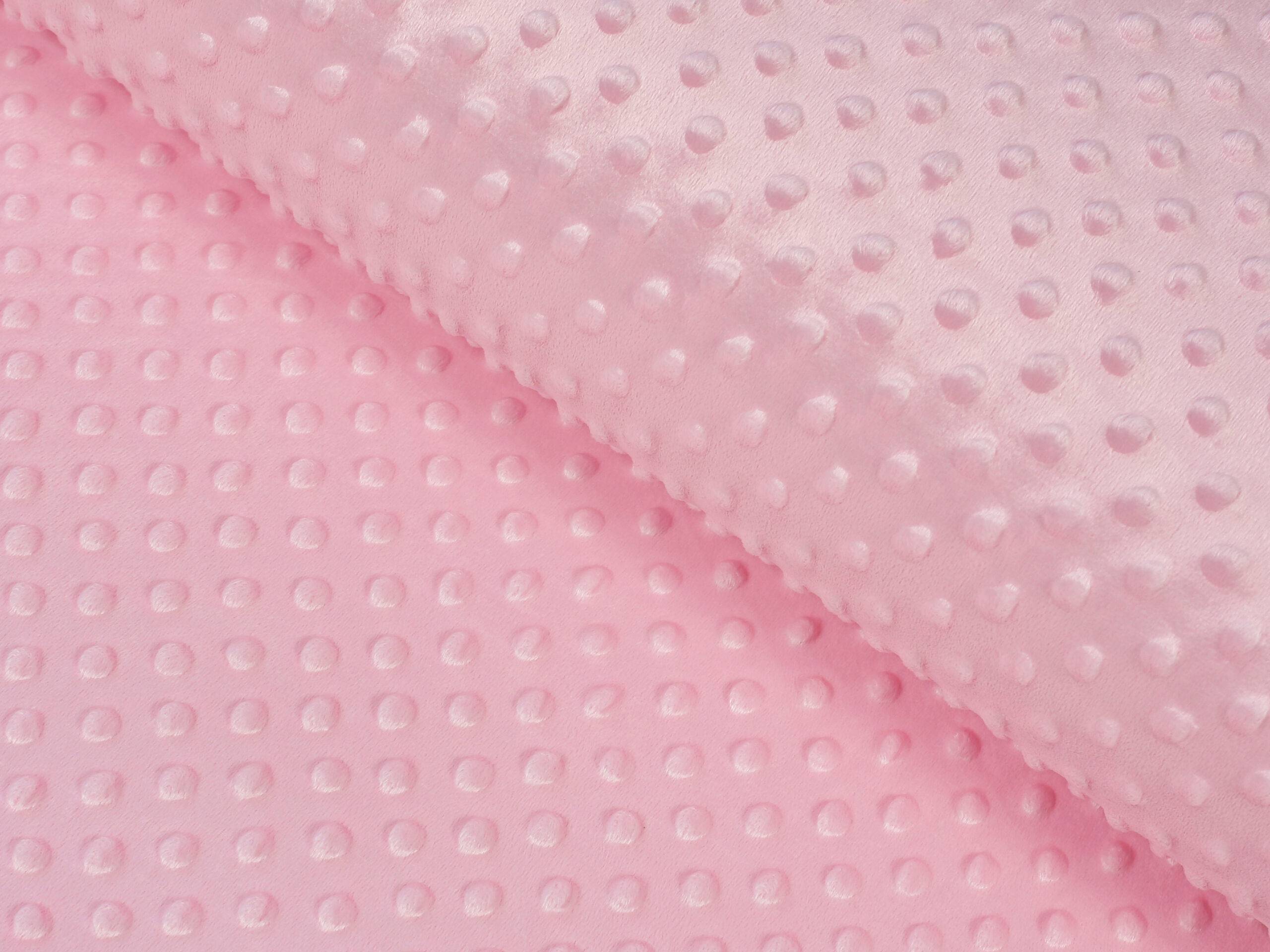 Naše Látka Minky růžová metráž, s puntíky, značky Škodák, je vyrobená z jemného 100% polyesteru s gramáží 250 g/m2 a šířce 150 cm.