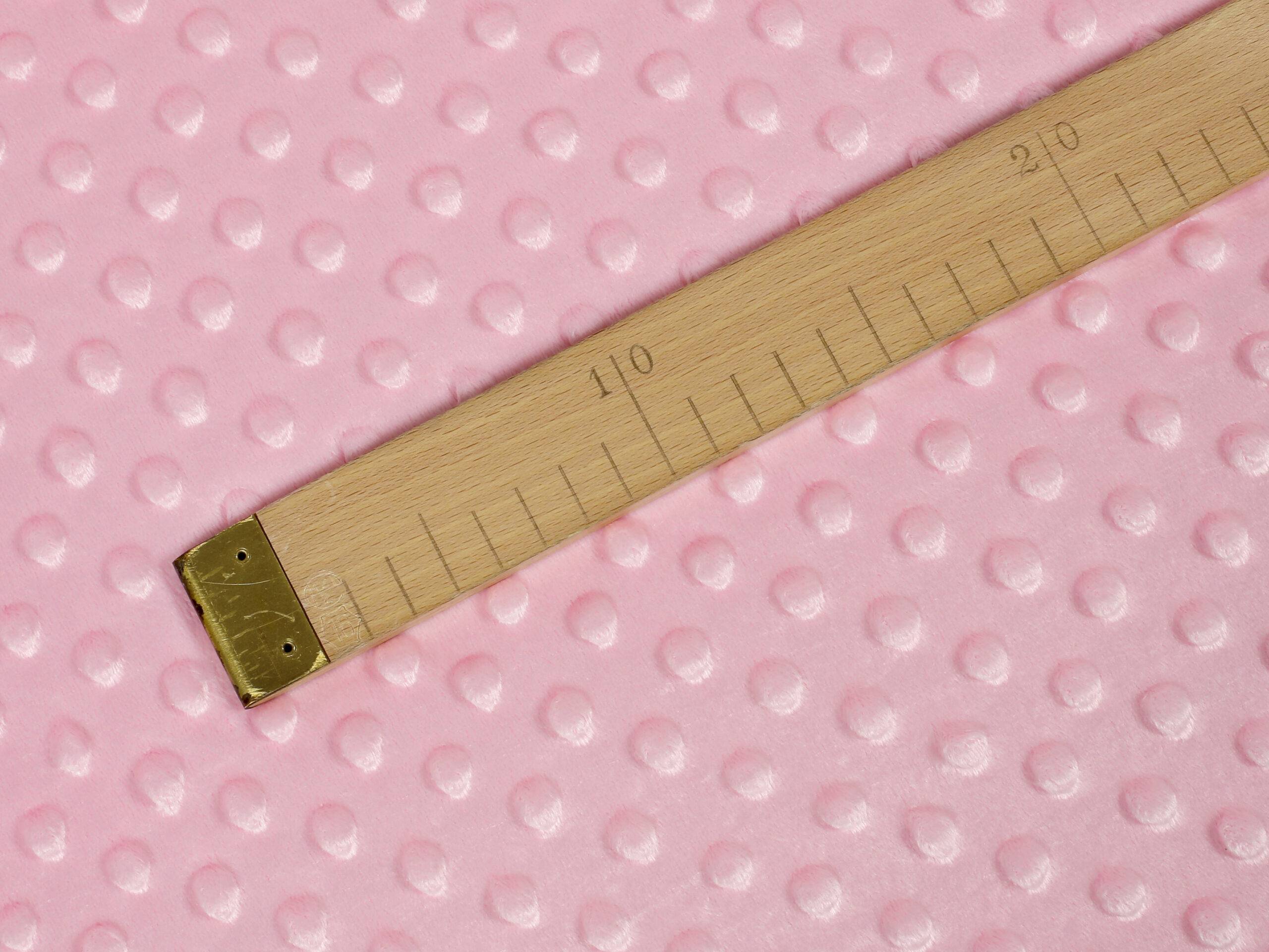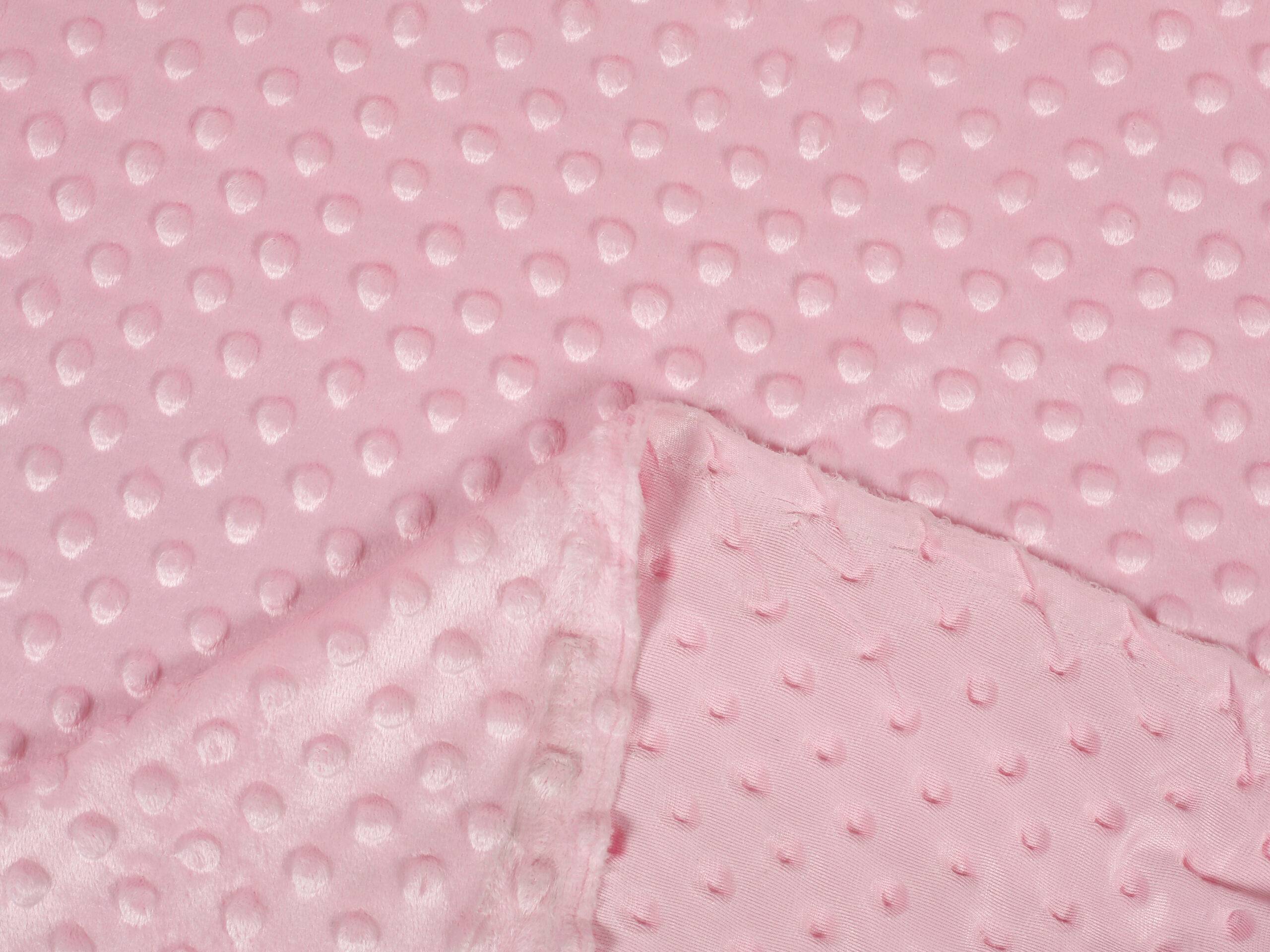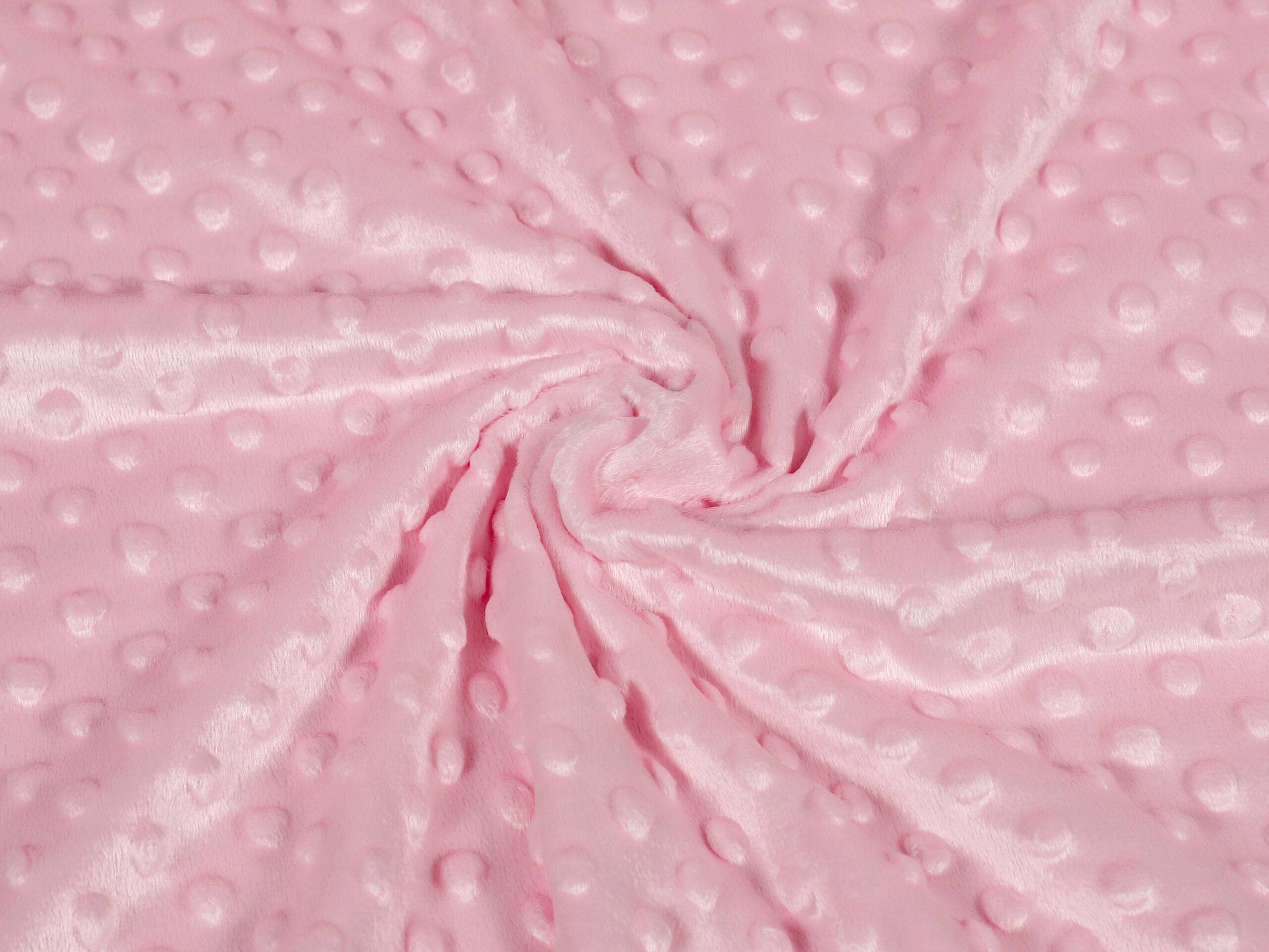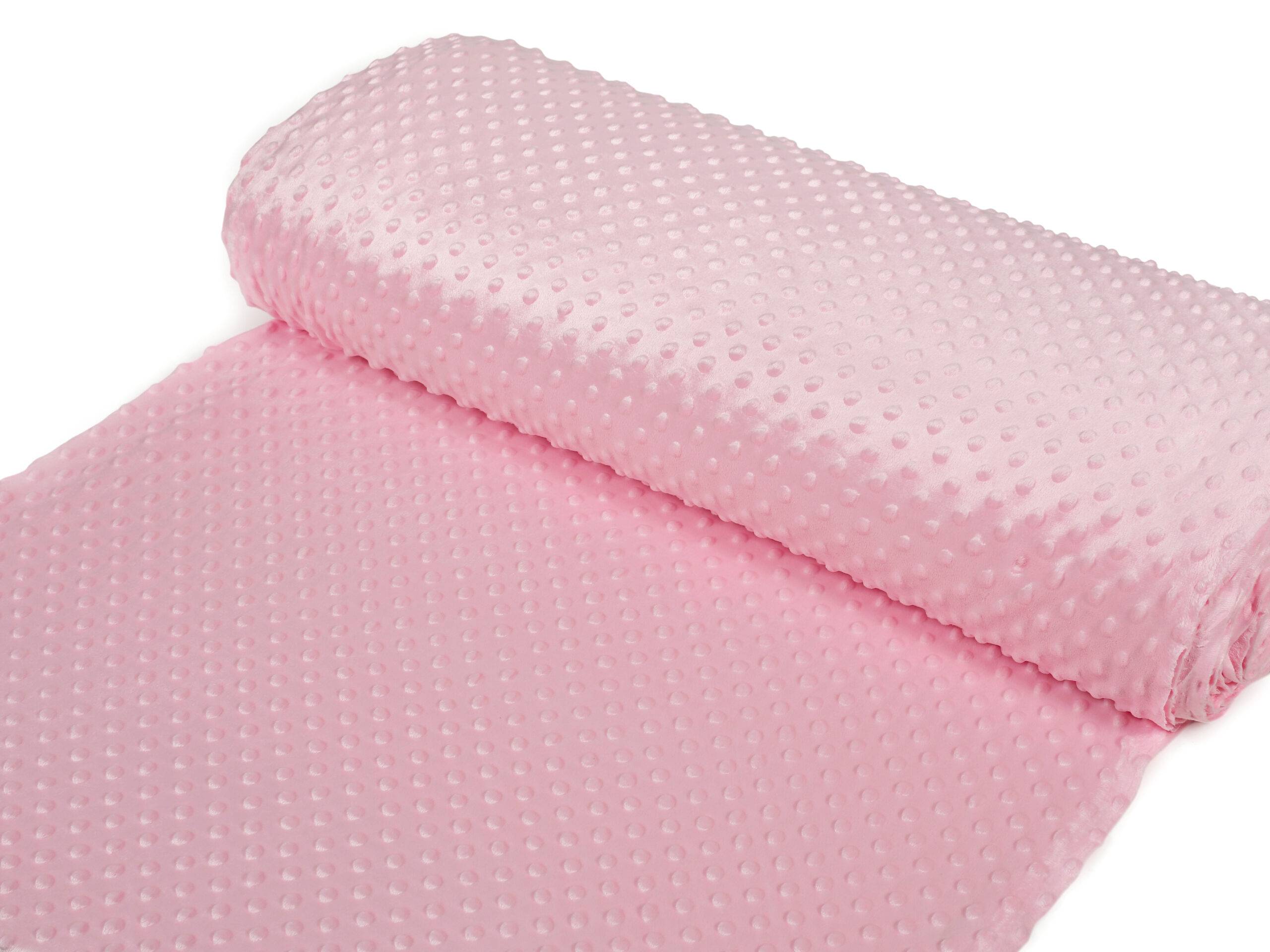 Naše Látka Minky růžová metráž, s puntíky, značky Škodák, je vyrobená z jemného 100% polyesteru s gramáží 250 g/m2 a šířce 150 cm.