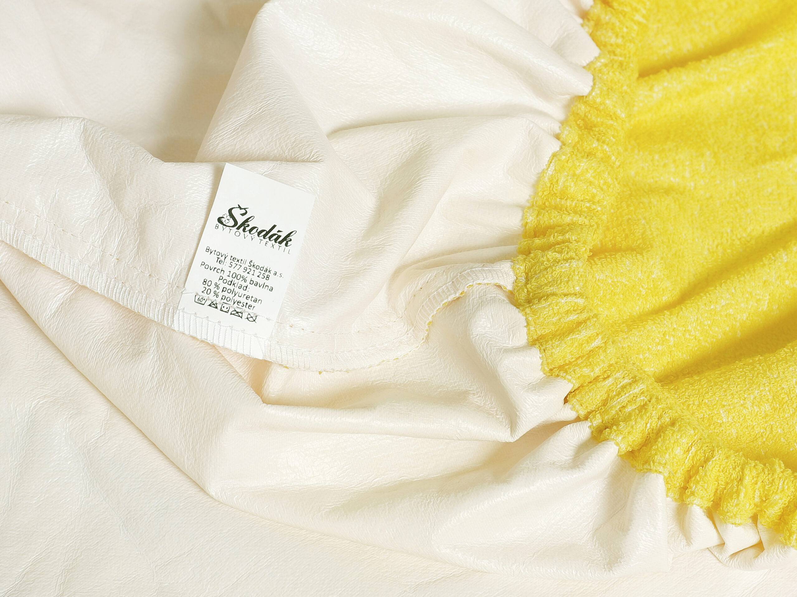 Naše nepropustné froté prostěradlo světle žluté s napínací gumou spojuje kvalitu a dlouhou životnost. Prostěradlo tvoří ze spodní strany 100% polyuretan. Vrchní část tvoří 100% bavlna ve froté úpravě. Froté prostěradlo vám zpříjemní spánek a přinese do vaší ložnice příjemnou atmosféru v každém ročním období.