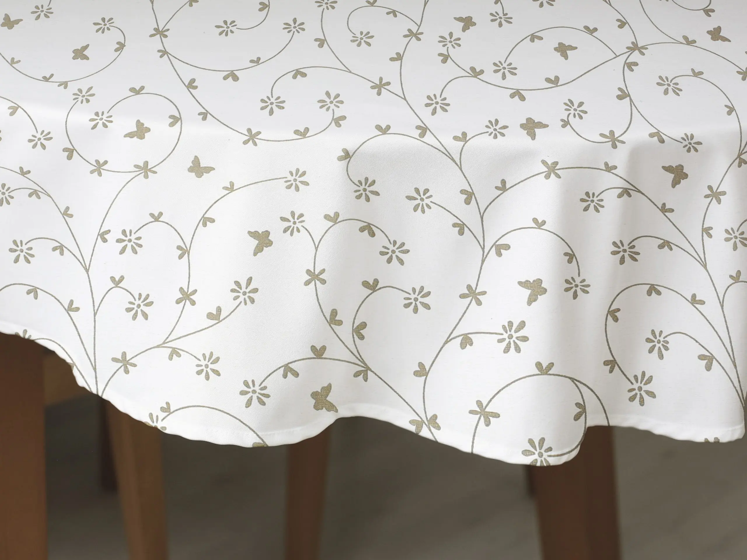 Oválný bavlněný ubrus se vzorem béžových kytiček na bílé je ideální volbou pro ty, kteří hledají kombinaci elegance a funkčnosti. Dejte svému stolu šmrnc s tímto nádherným květinovým ubrusem, který je skvělým doplňkem pro každou příležitost. Skvělá investice pro váš jídelní stůl. Ubrus se skvěle hodí pro každodenní použití.