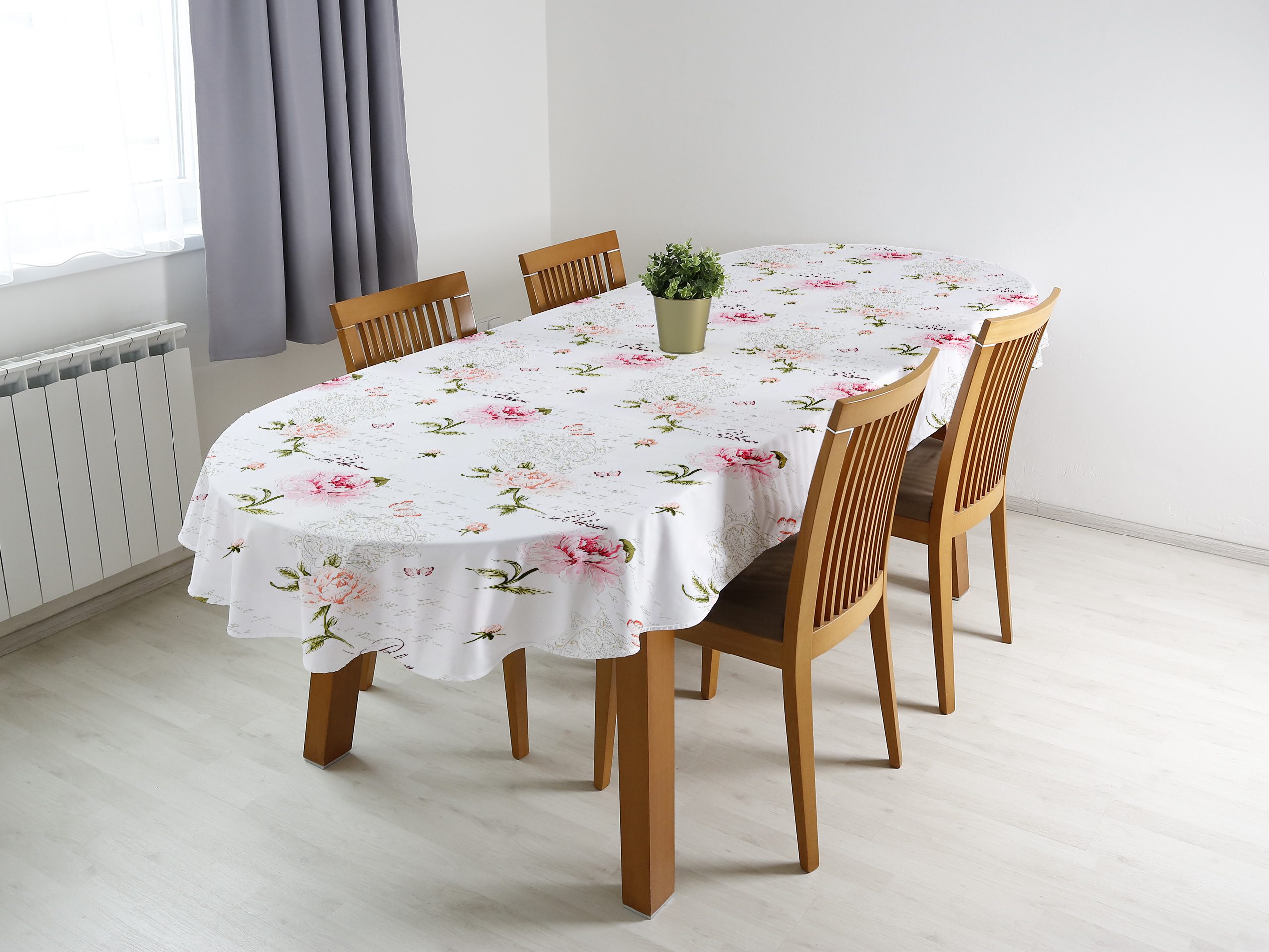 Oválný bavlněný ubrus se vzorem růžových pivoněk na bílé je ideální volbou pro ty, kteří hledají kombinaci elegance a funkčnosti. Dejte svému stolu šmrnc s tímto nádherným květinovým ubrusem, který je skvělým doplňkem pro každou příležitost. Skvělá investice pro váš jídelní stůl. Ubrus se skvěle hodí pro každodenní použití.
