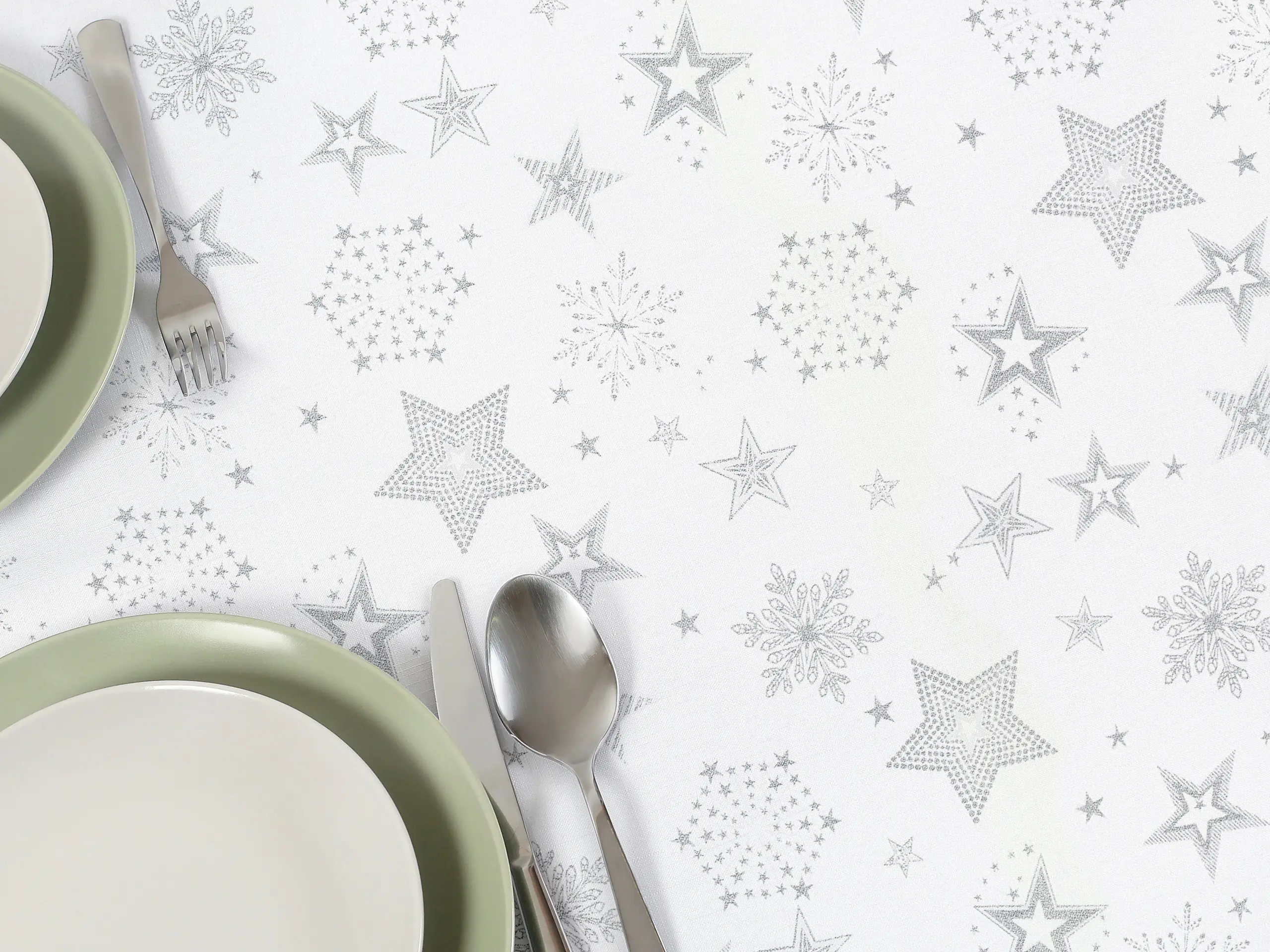 Náš oválný dekorační ubrus stříbrné hvězdy na bílé je tím pravým doplňkem, který vnese do vašeho domova vánoční atmosféru a dodá vašemu jídelnímu stolu půvabný šarm. Jeho jemně tkaný motiv vytváří harmonii elegance a útulnosti.