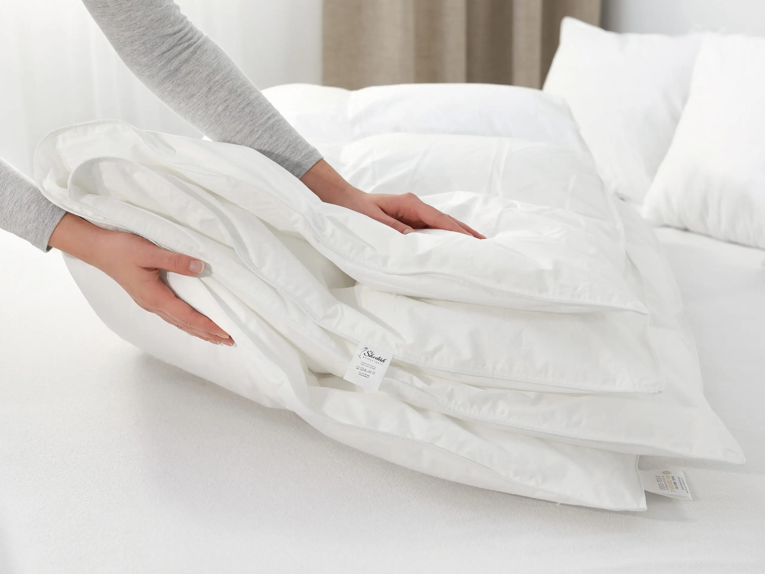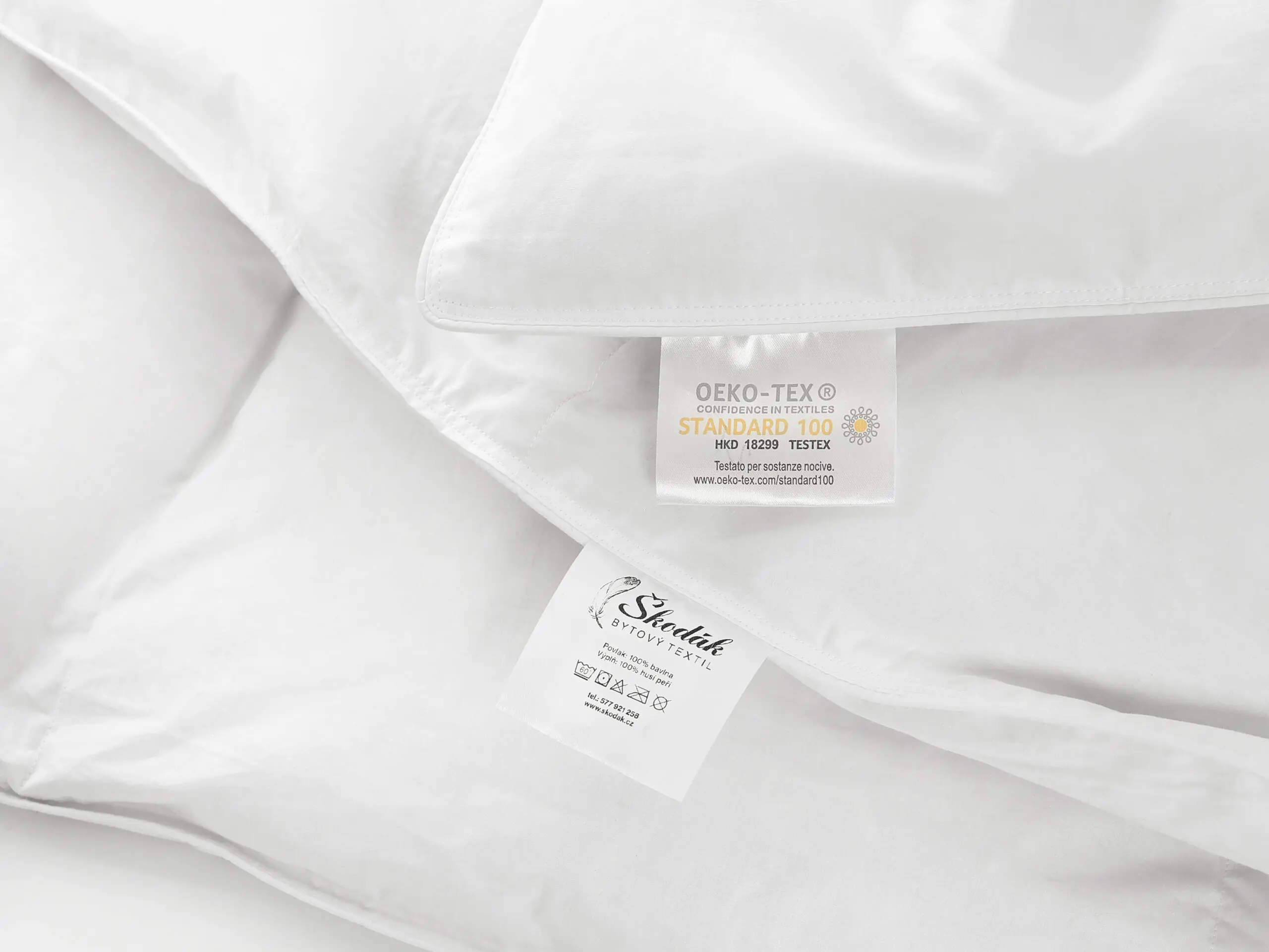 Použité peří prochází důkladným praním a sušením při vysokých teplotách a výrobek splňuje evropskou normu EN 12935 / DAUNASAN, která zaručuje zdravotní nezávadnost a hygienickou čistotu. Husí peří má přirozenou schopnost odvádět vlhkost a udržovat stabilní mikroklima, takže péřová přikrývka v zimě příjemně zahřeje a v teplejších měsících nepřehřívá. Přikrývku vyrábíme kompletně v našich českých šicích dílnách Škodák, kde máme plnou kontrolu nad kvalitou materiálů i precizním zpracováním.