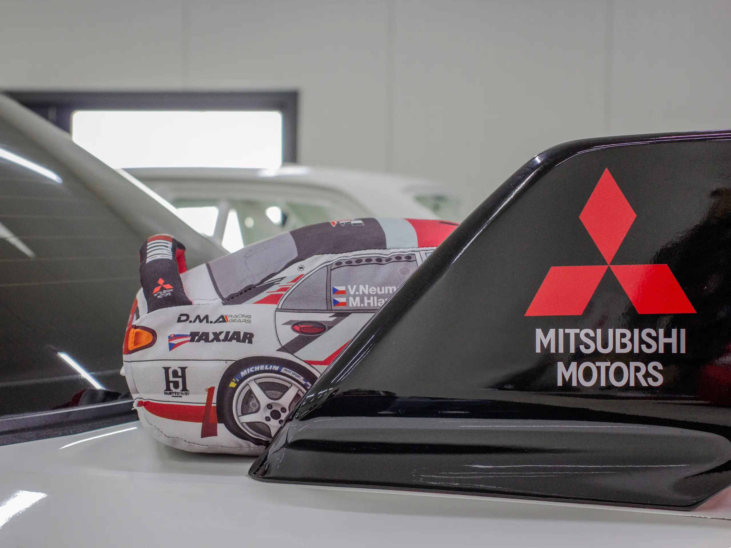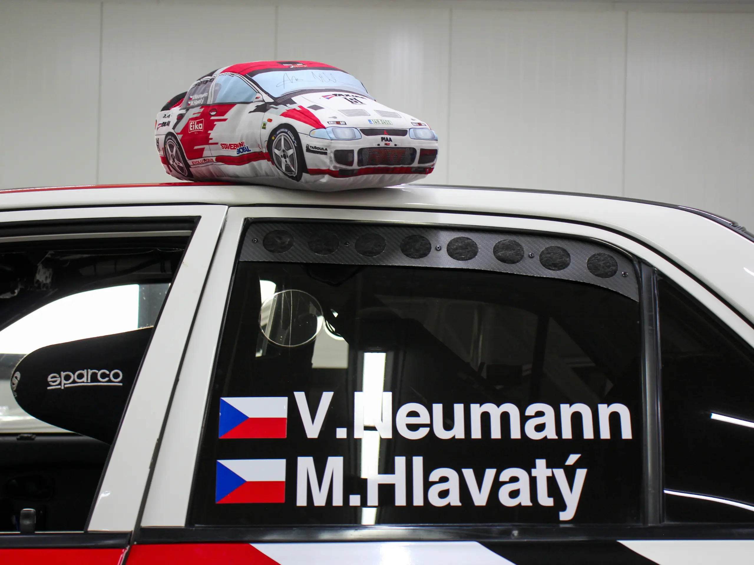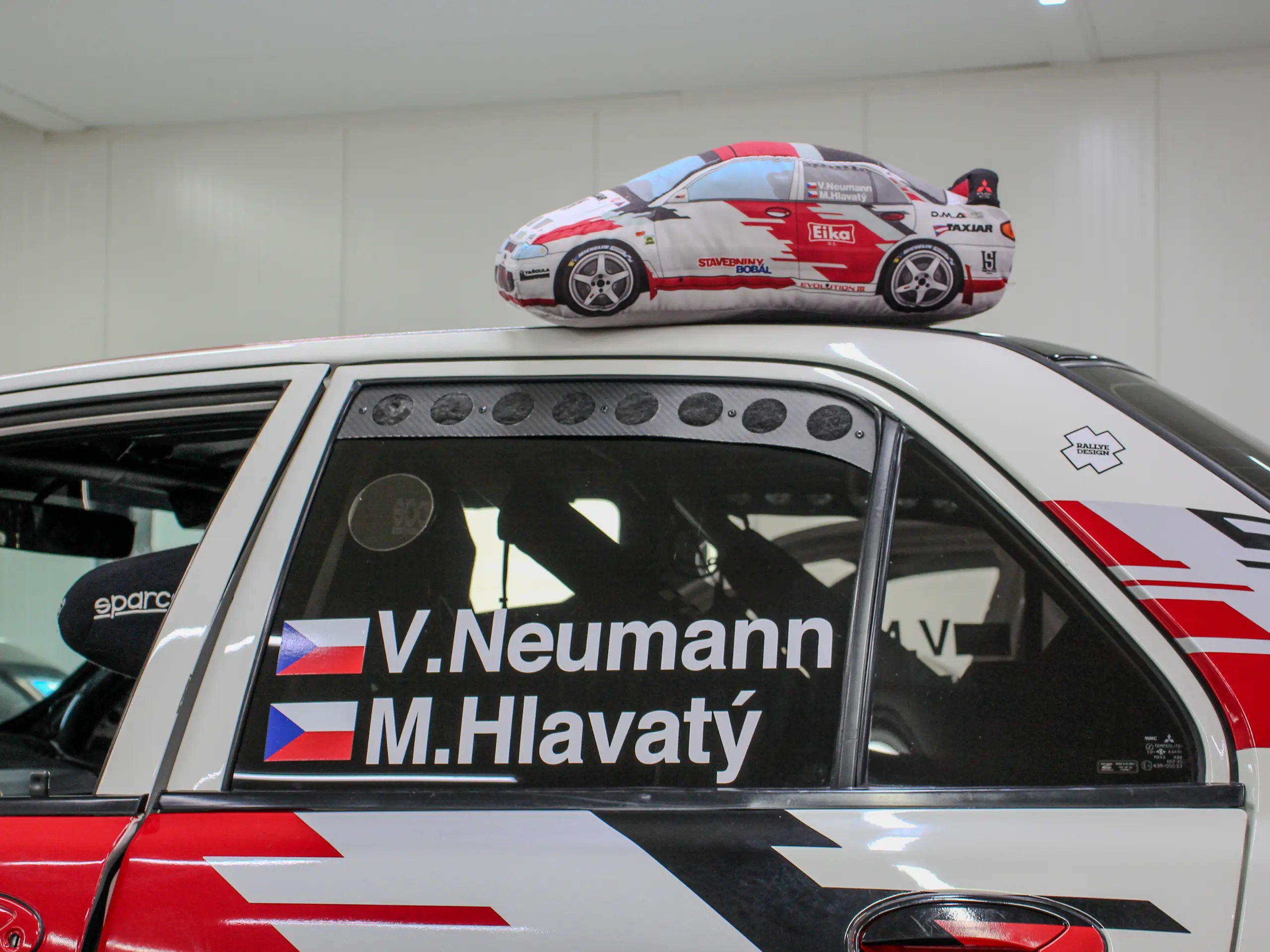 3D polštář ve tvaru rally vozu Mitsubishi Lancer Evo III řízeného českým závodníkem Vlastimilem Neumannem. Rozměry auta 50x20x20cm a potah z kvalitního 100% polyesteru.