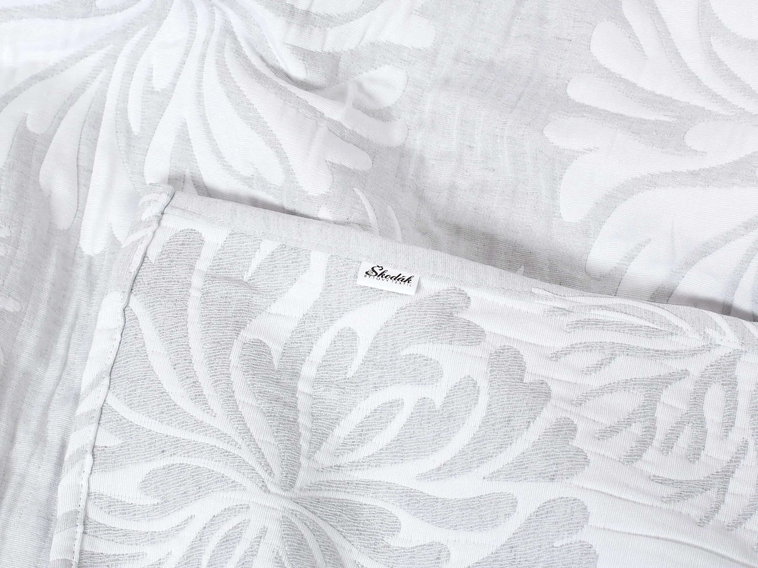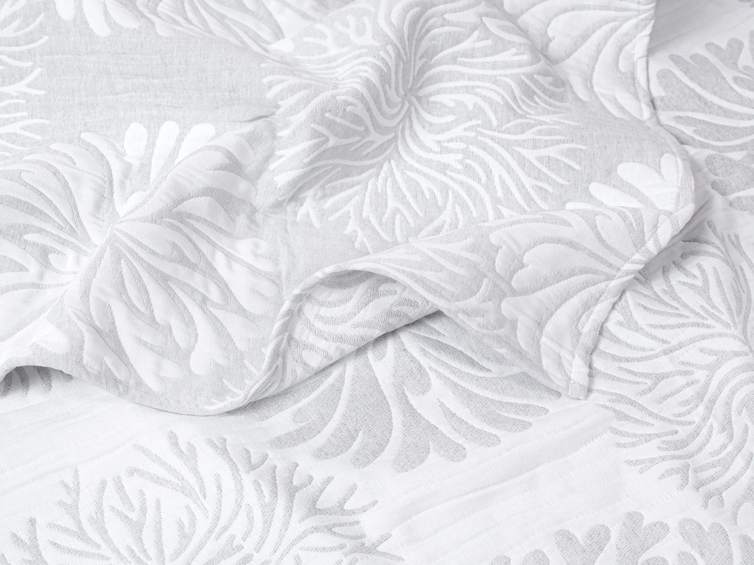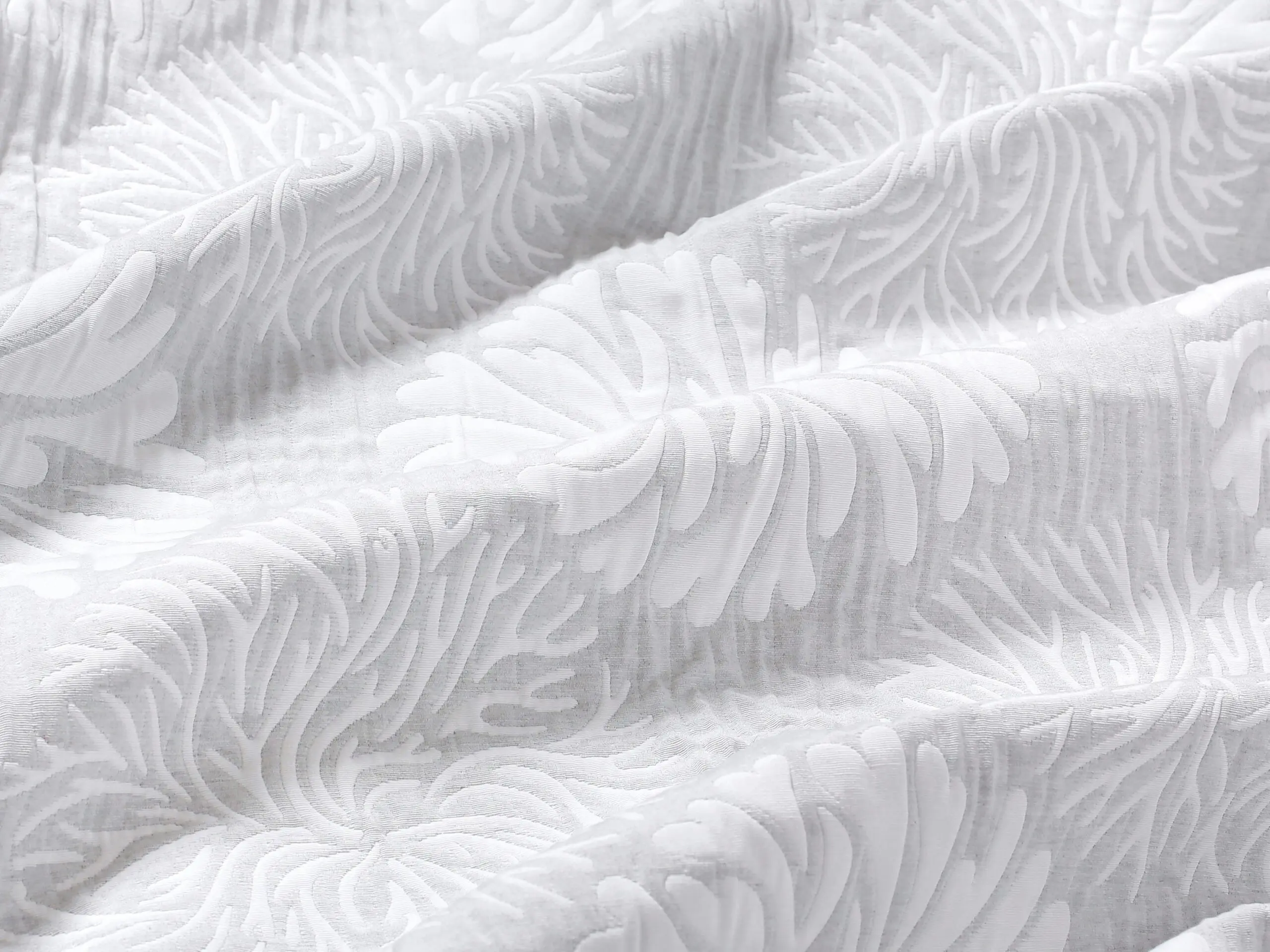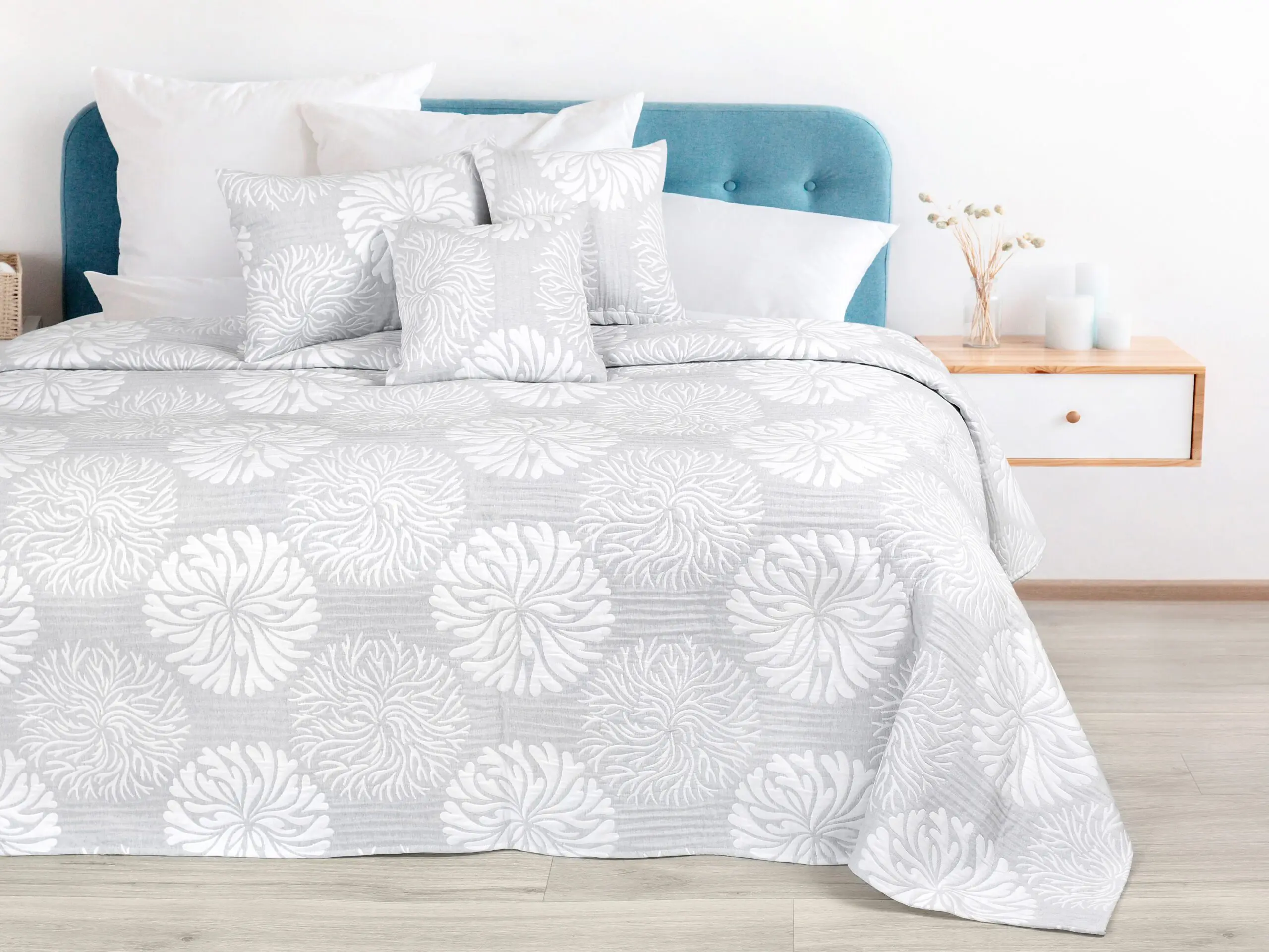 Náš prošívaný přehoz na postel bílé květy na světle šedé spojuje styl a funkčnost. Je vyrobený z 80% polyesteru a 20% bavlny. Náš světle šedý prošívaný přehoz je zárukou kvality a dlouhé životnosti. Jemná textura materiálu poskytuje pohodlí a jemnost. Je oboustranný, z jedné strany jsou bílé květy a na druhé straně jsou květy šedé na bílém podkladu.