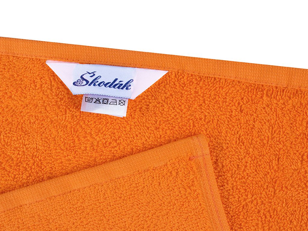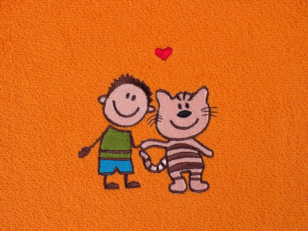 Náš ručník LILI do školky oranžový s klukem s kočkou je ze 100% bavlny ve froté úpravě a vysokou gramáží 400g/m2.
