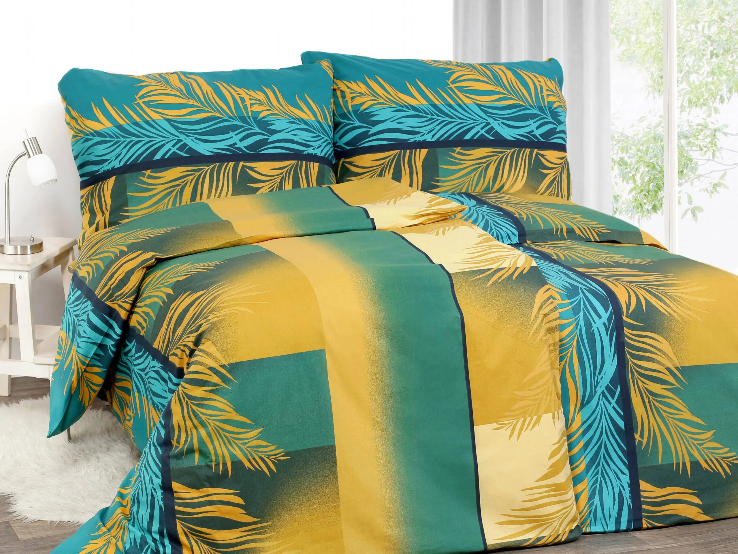Díky speciální leštěné úpravě působí toto povlečení se vzorem petrolejového listí na hořčicové barvě velmi luxusně.
