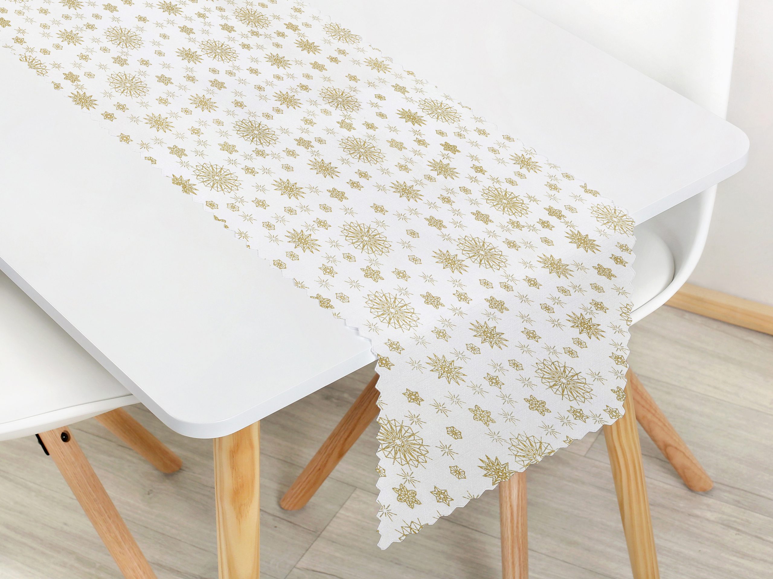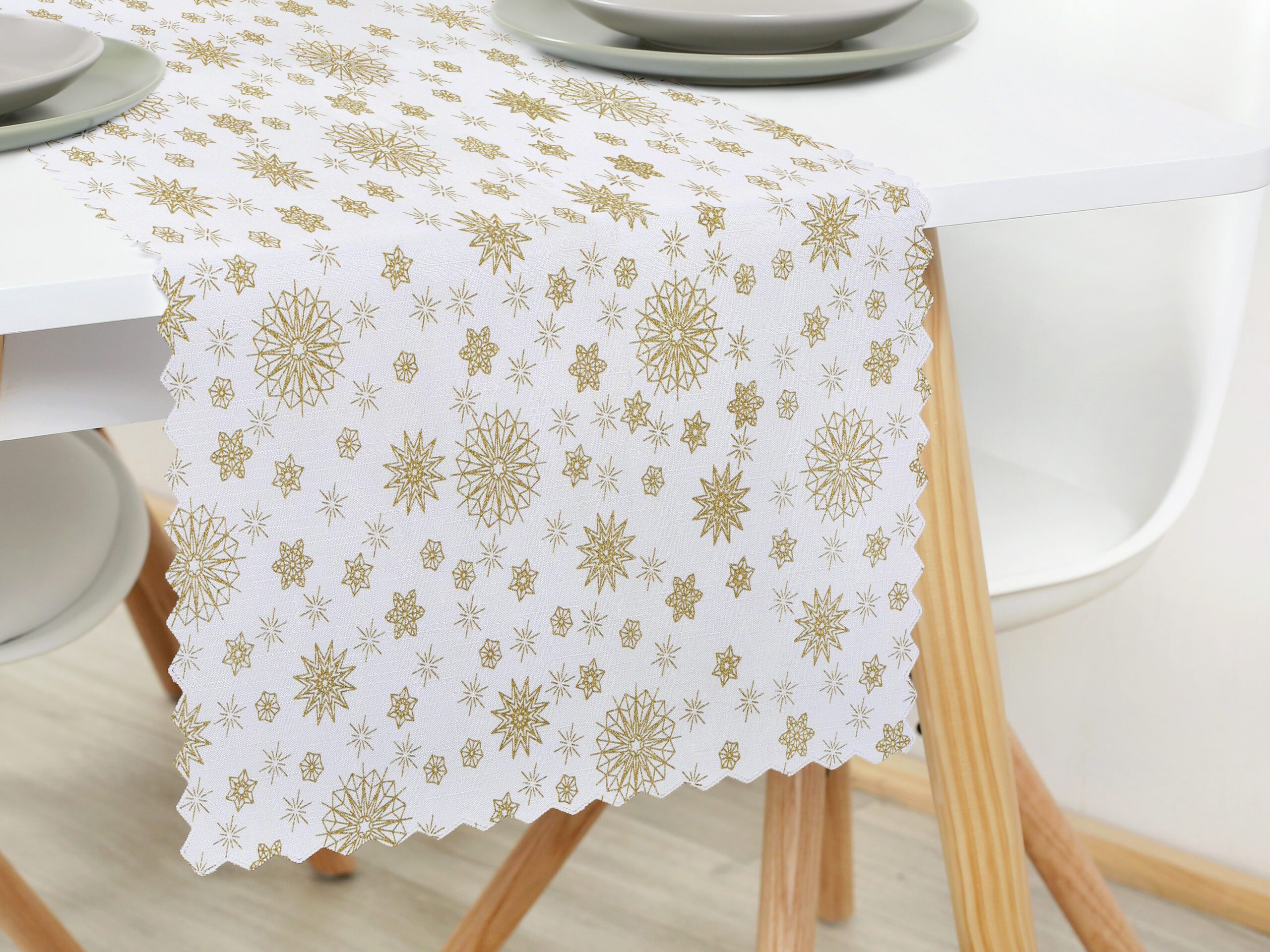 Náš teflonový běhoun zlaté vločky a hvězdičky je přesně to, co oživí váš jídelní stůl a dodá mu nový nádech. Díky kvalitnímu provedení a použitému polyesteru je tento vánoční běhoun nejen krásný, ale i odolný. Všechny skvrny a vylité tekutiny snadno setřete hadříkem.