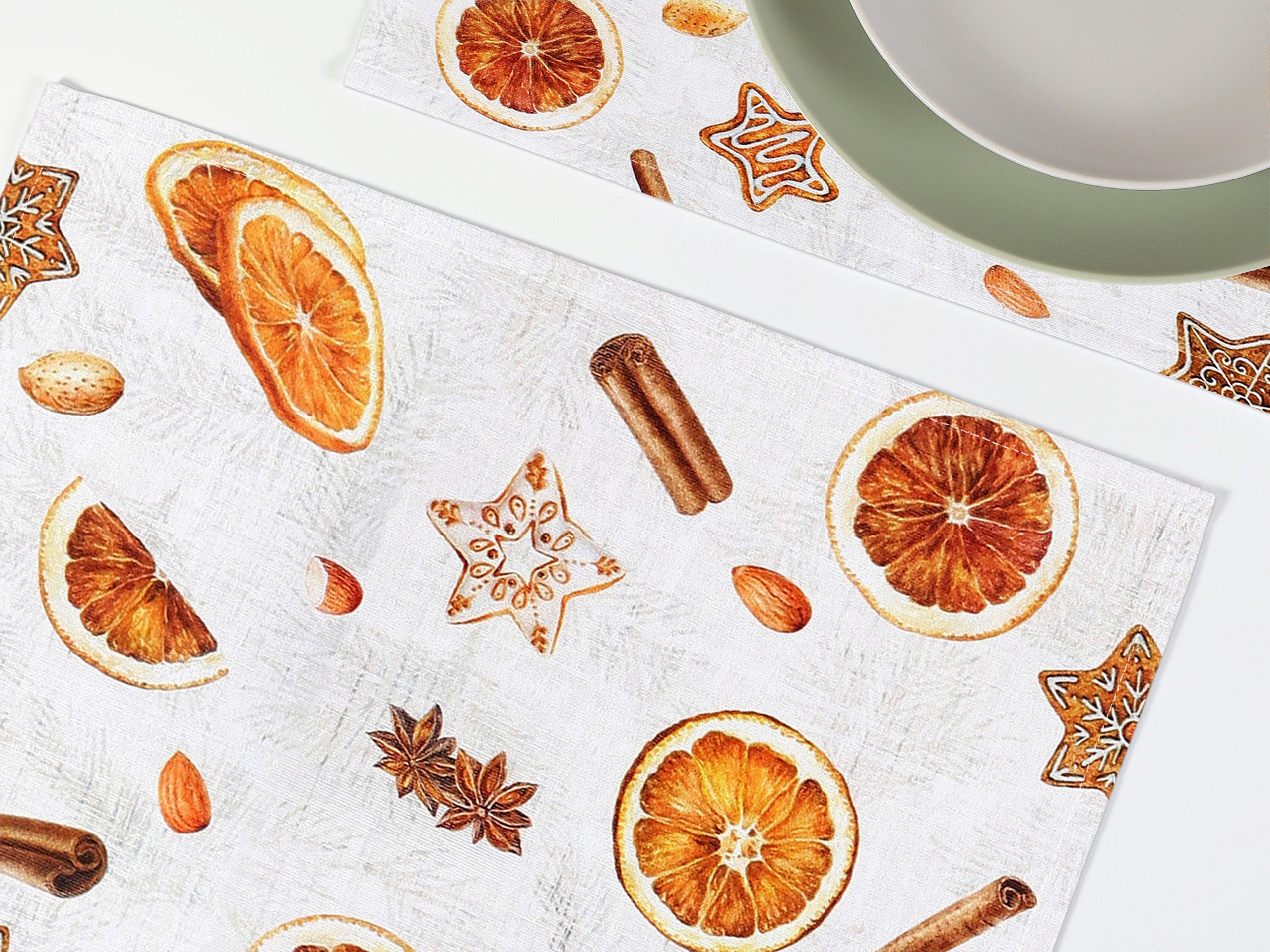 Jeho stálobarevnost zaručuje, že i po mnoha praních bude zářit krásnými barvami. Díky vánočnímu vzoru s pomeranči a skořicí na světle béžové barvě a detailům plných svátečního kouzla dodáte vašemu stolu eleganci a okouzlující vánoční atmosféru.