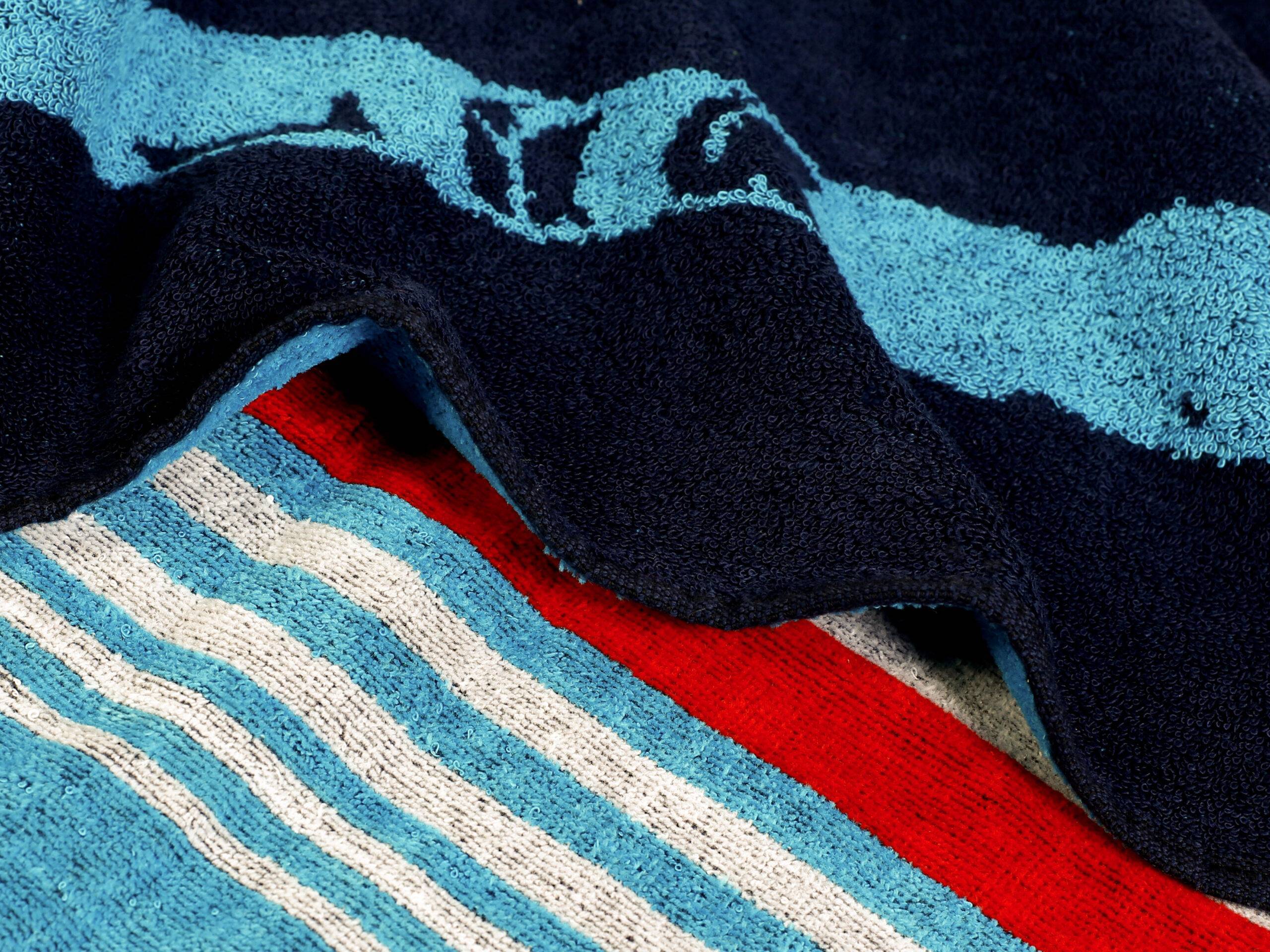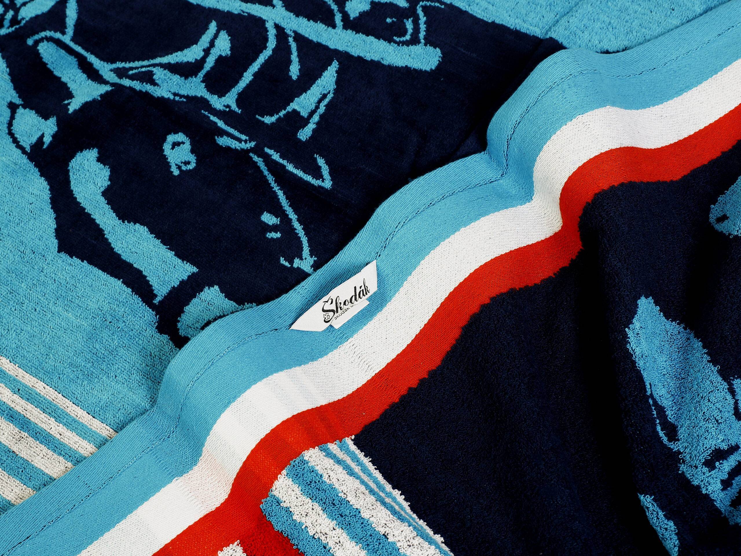 Naše velká plážová osuška polo na modré barvě je vyrobená ze 100% česané dlouhovlákné bavlny ve froté úpravě.